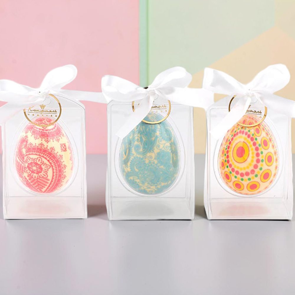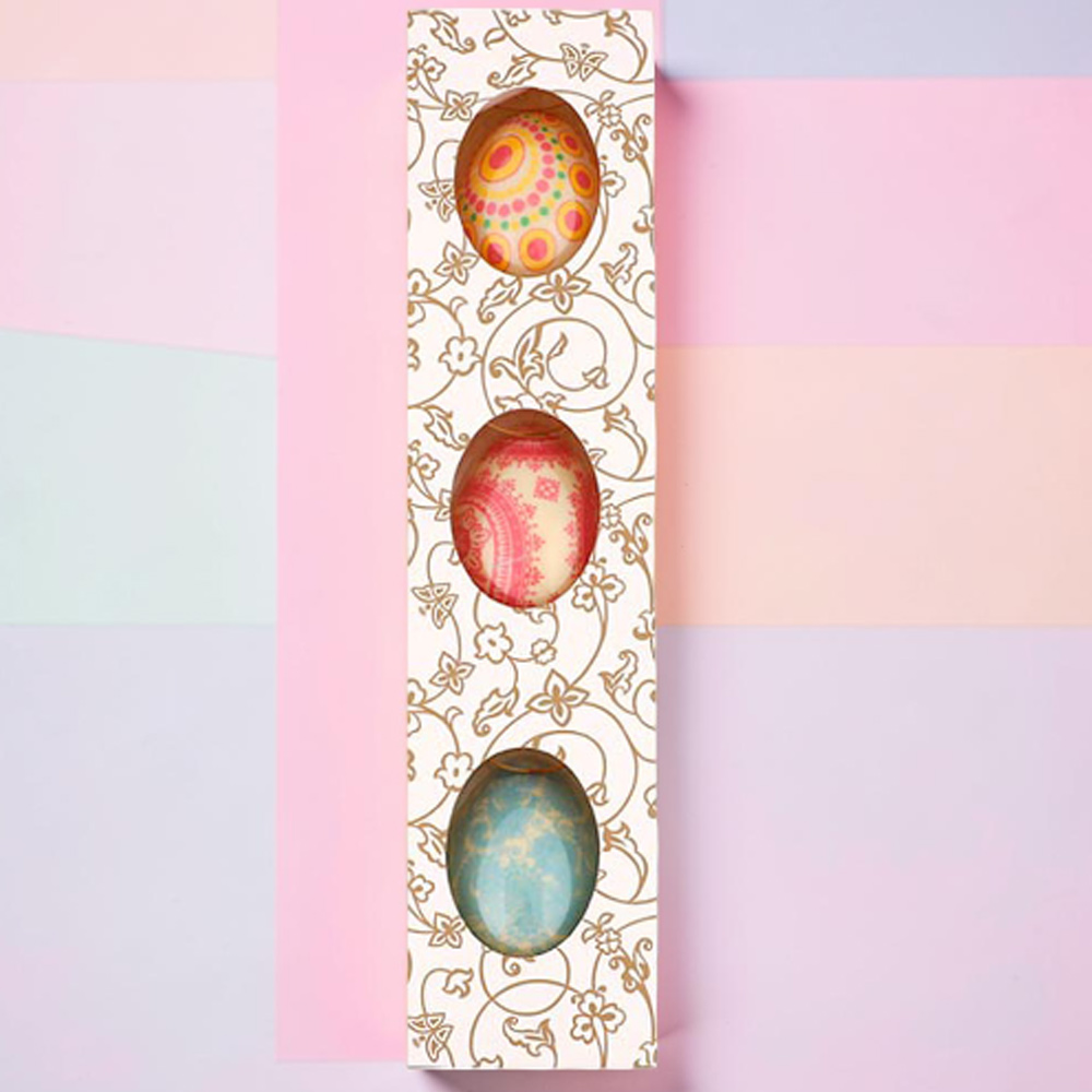 Тандем ярких, сочных цветовых оттенков росписи на белом шоколаде и пышного растительного орнамента на упаковке выглядит оригинально и красиво.