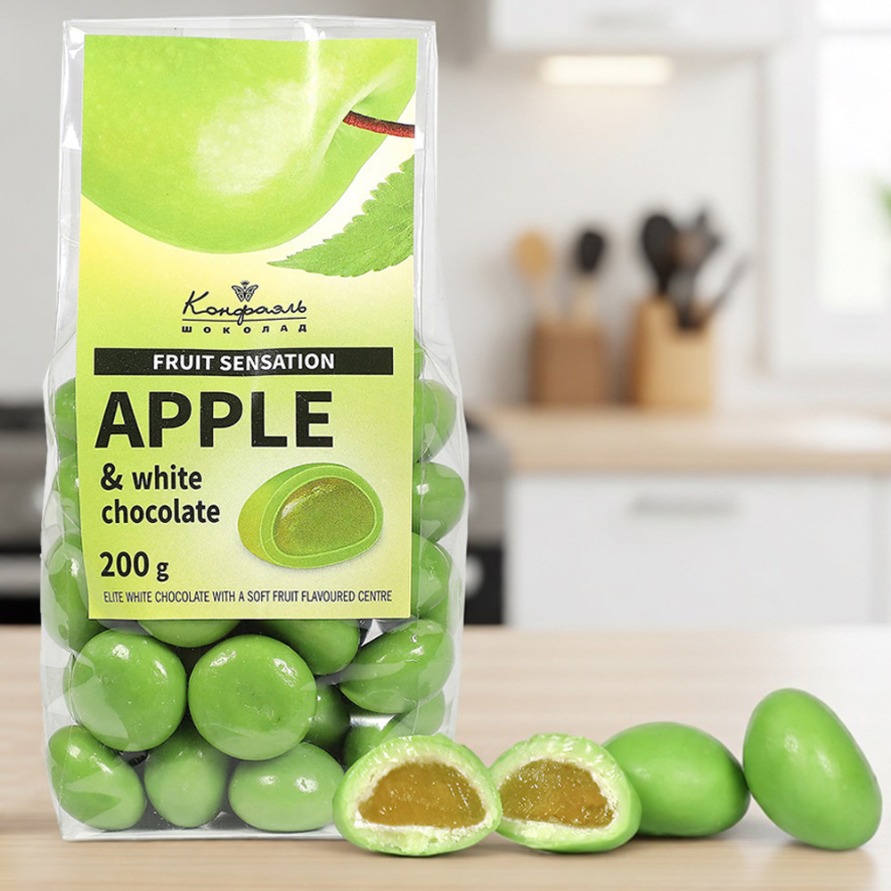 какао масло, молоко сухое цельное, молоко сухое обезжиренное, лактоза, эмульгатор (лецитин соевый), ароматизатор («Ванилин»); декор – пищевой краситель (концентрированный сок красной редиски, масло подсолнечное, эмульгаторы (мальтодекстрин, Е472с), регуляторы кислотности (лимонная кислота, аскорбиновая кислота)), глазирователь (капол); начинка – сахар, патока, желирующий агент (агар, желатин), регулятор кислотности (лимонная кислота), ароматизатор («Яблоко»)