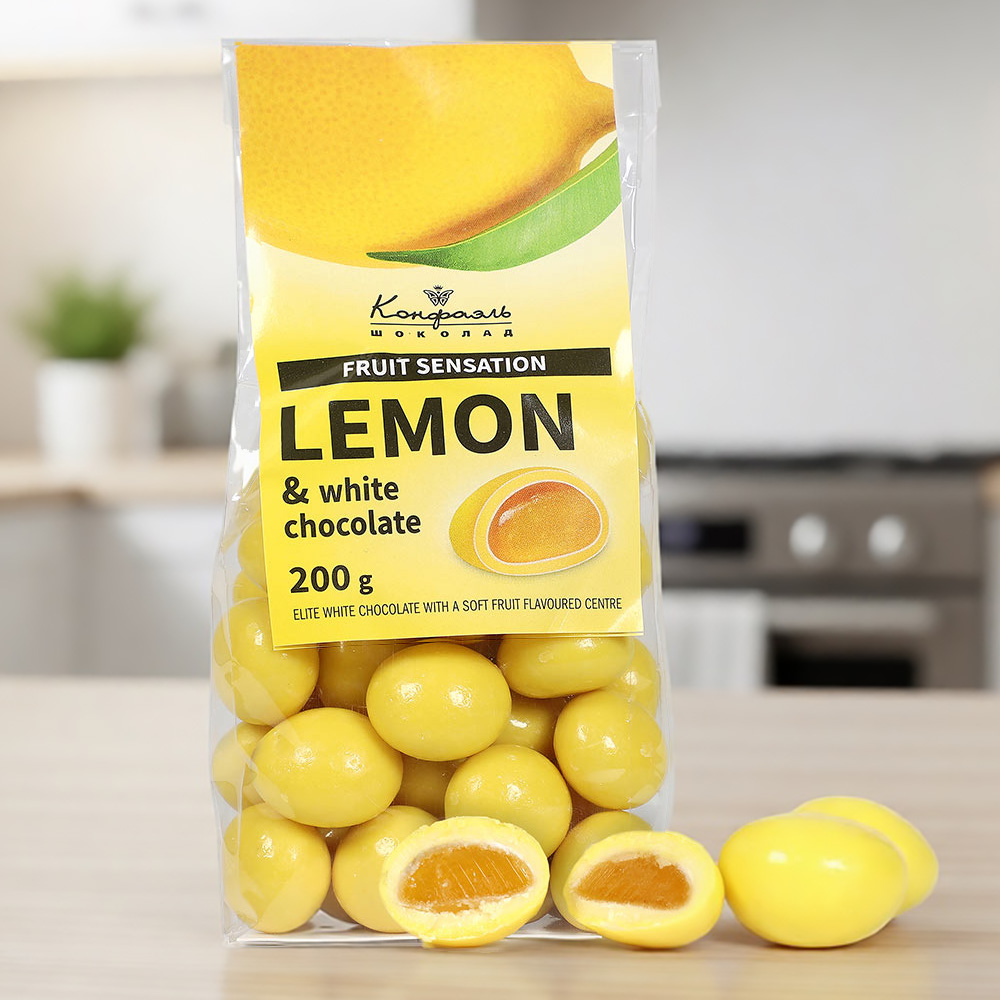 какао масло, молоко сухое цельное, молоко сухое обезжиренное, лактоза, эмульгатор (лецитин соевый), ароматизатор («Ванилин»); декор – пищевой краситель (концентрированный сок красной редиски, масло подсолнечное, эмульгаторы (мальтодекстрин, Е472с), регуляторы кислотности (лимонная кислота, аскорбиновая кислота)), глазирователь (капол); начинка – сахар, патока, желирующий агент (агар, желатин), регулятор кислотности (лимонная кислота), ароматизатор («Лимон»)