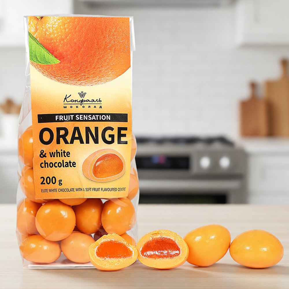 шоколадная масса – какао-масло, сахар, молоко сухое цельное, молоко сухое обезжиренное, лактоза, эмульгатор (лецитин соевый), ароматизаторы («Ванилин», «Апельсин»); начинки – сахар, патока, натуральный концентрированный Апельсиновый сок, желирующие агенты (агар, желатин говяжий), регулятор кислотности (Апельсиновая кислота), ароматизаторы, натуральный пищевой краситель «Турмерик», глазирователь (капол).