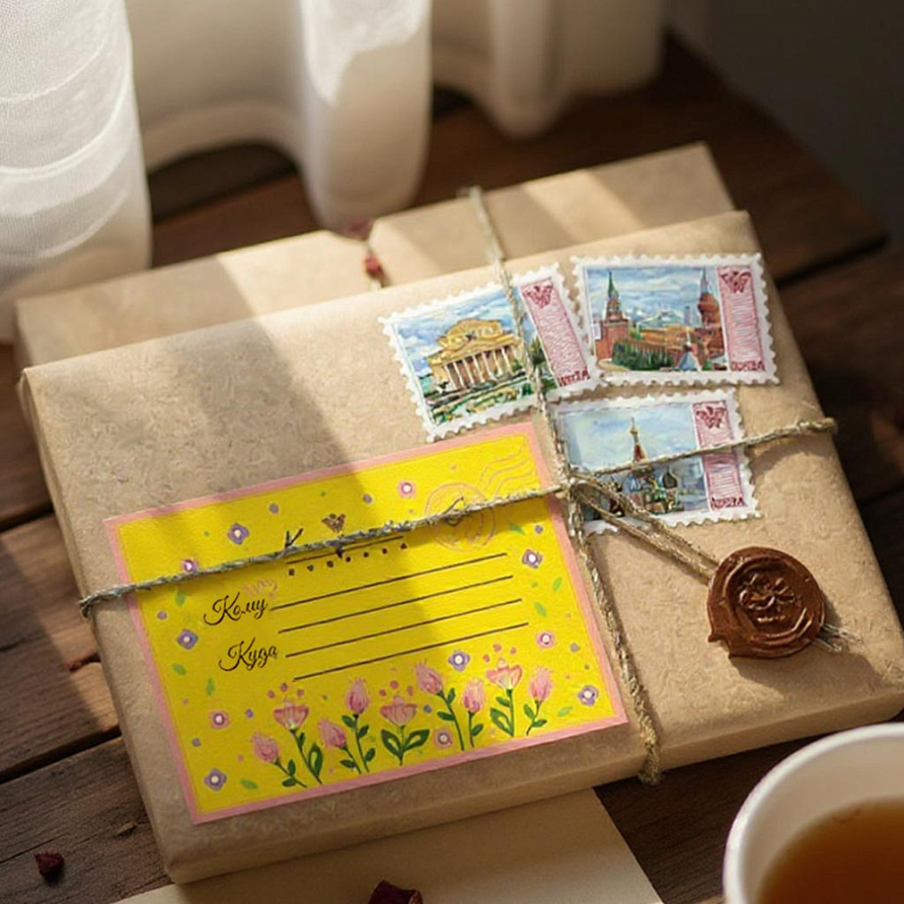1) В крафтовой бумаге, с оформлением как телеграмма;
