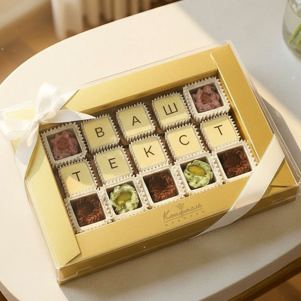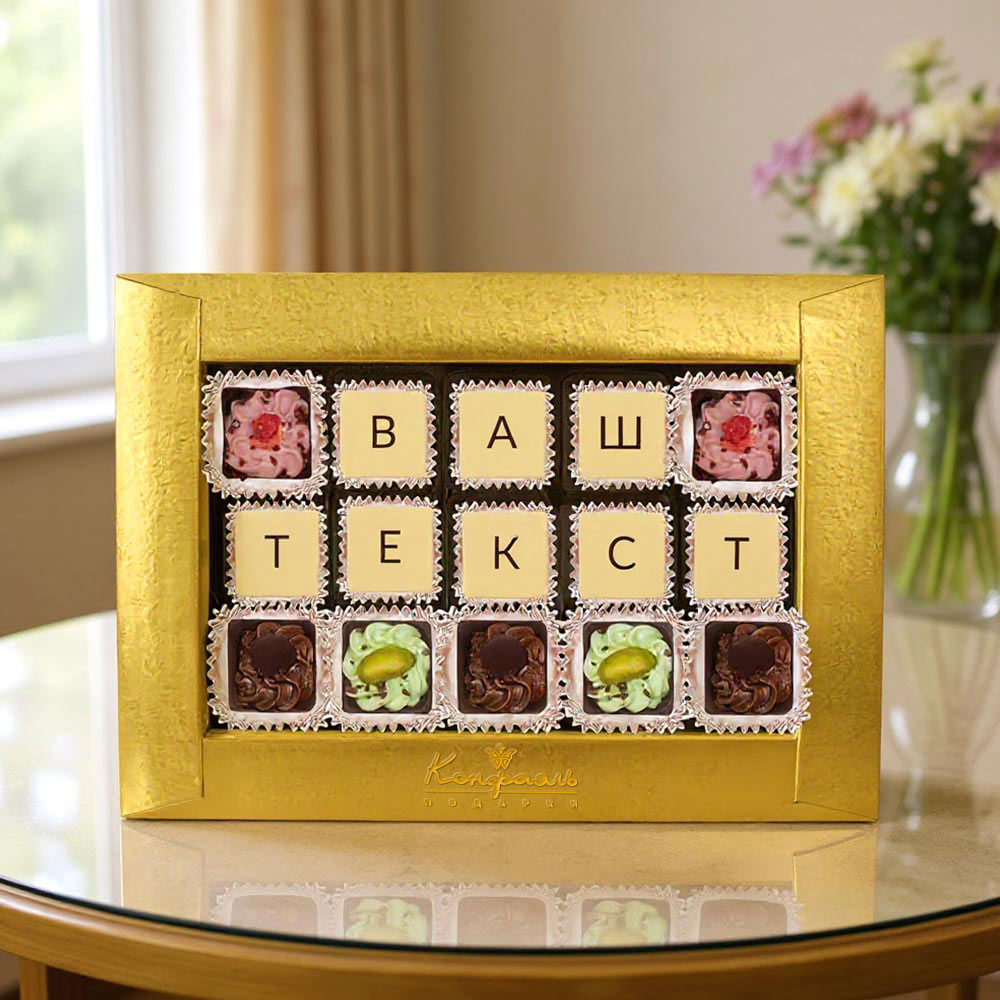 Текст выкладывается съедобной шоколадной мозаикой, которую с удовольствием съест получатель.