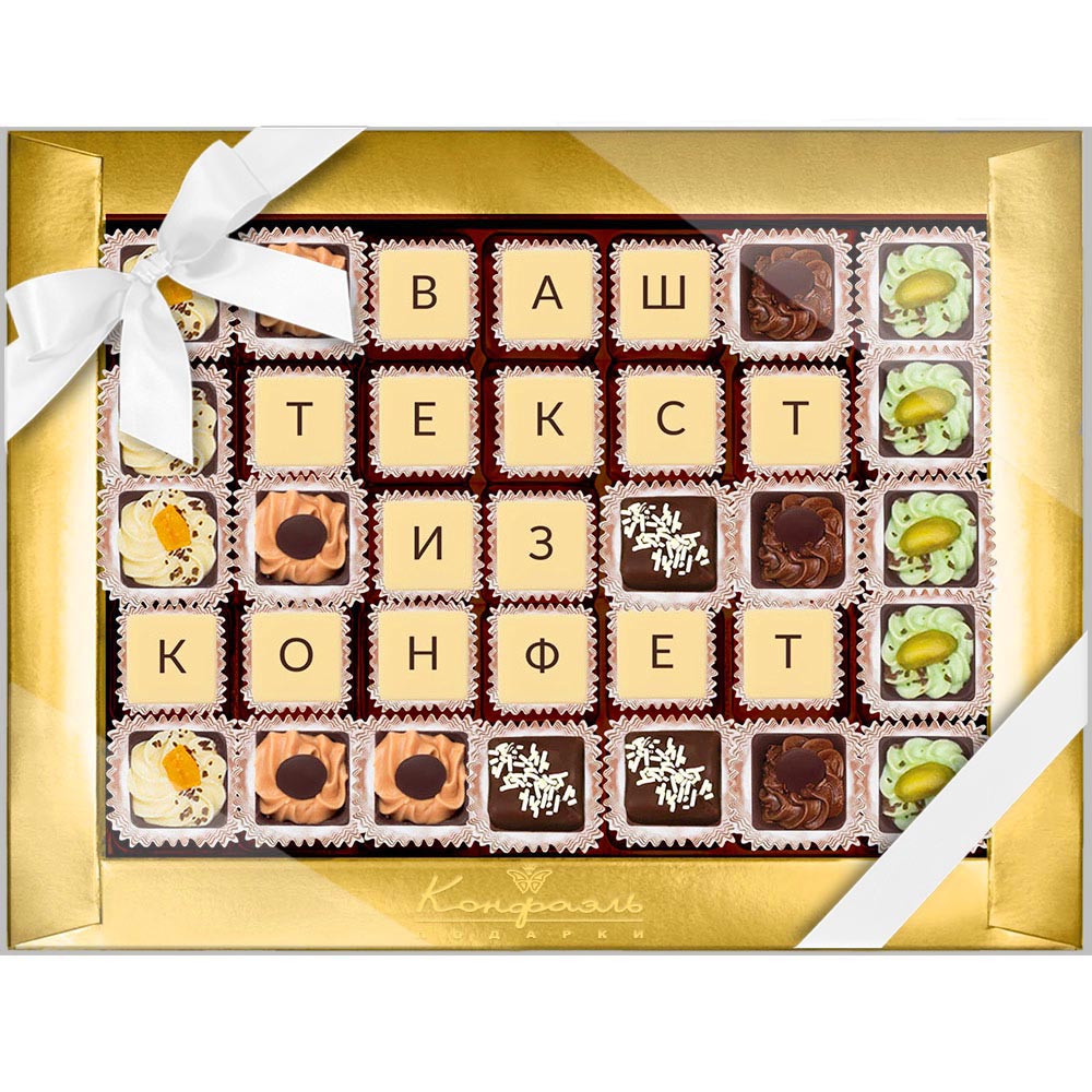 Текст выкладывается съедобной шоколадной мозаикой, которую с удовольствием съест получатель.