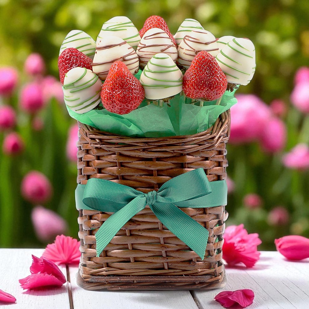 клубника, конфеты глазированные с декором белым, цветным шоколадом и миндалем