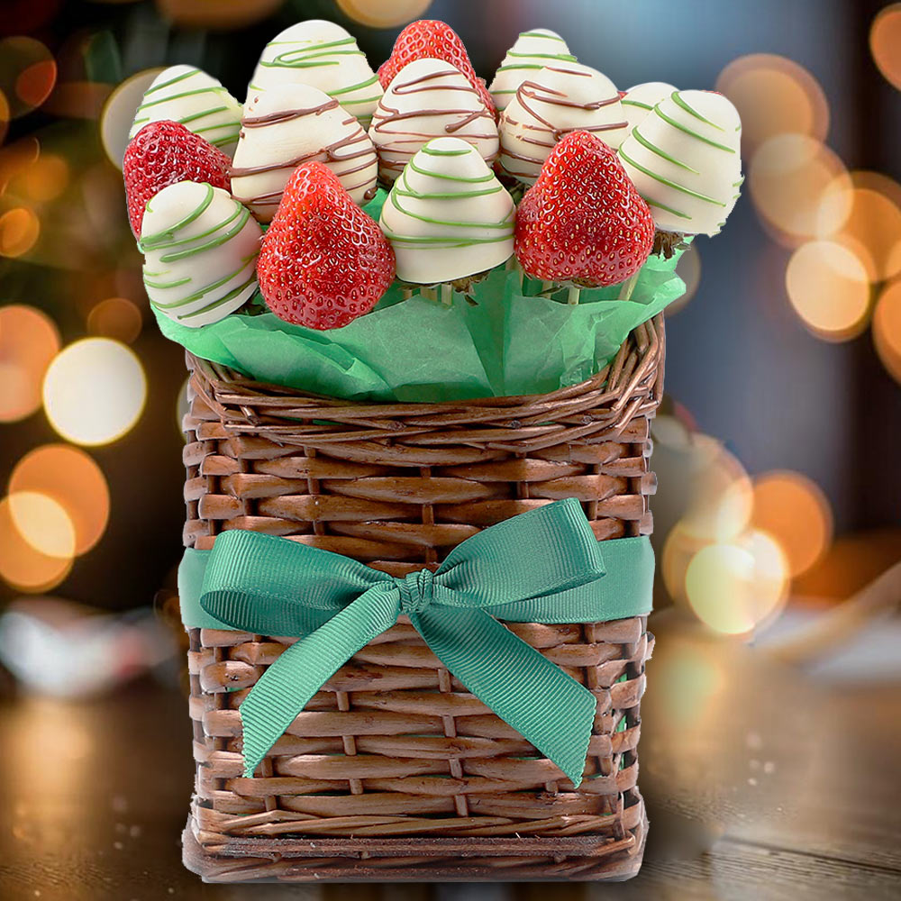 клубника свежая; шоколадные массы – какао-масло, какао тертое, сахар, молоко сухое цельное, молоко сухое обезжиренное, лактоза, эмульгатор (лецитин соевый), ароматизатор («Ванилин»); декор – пищевой краситель (Е141).