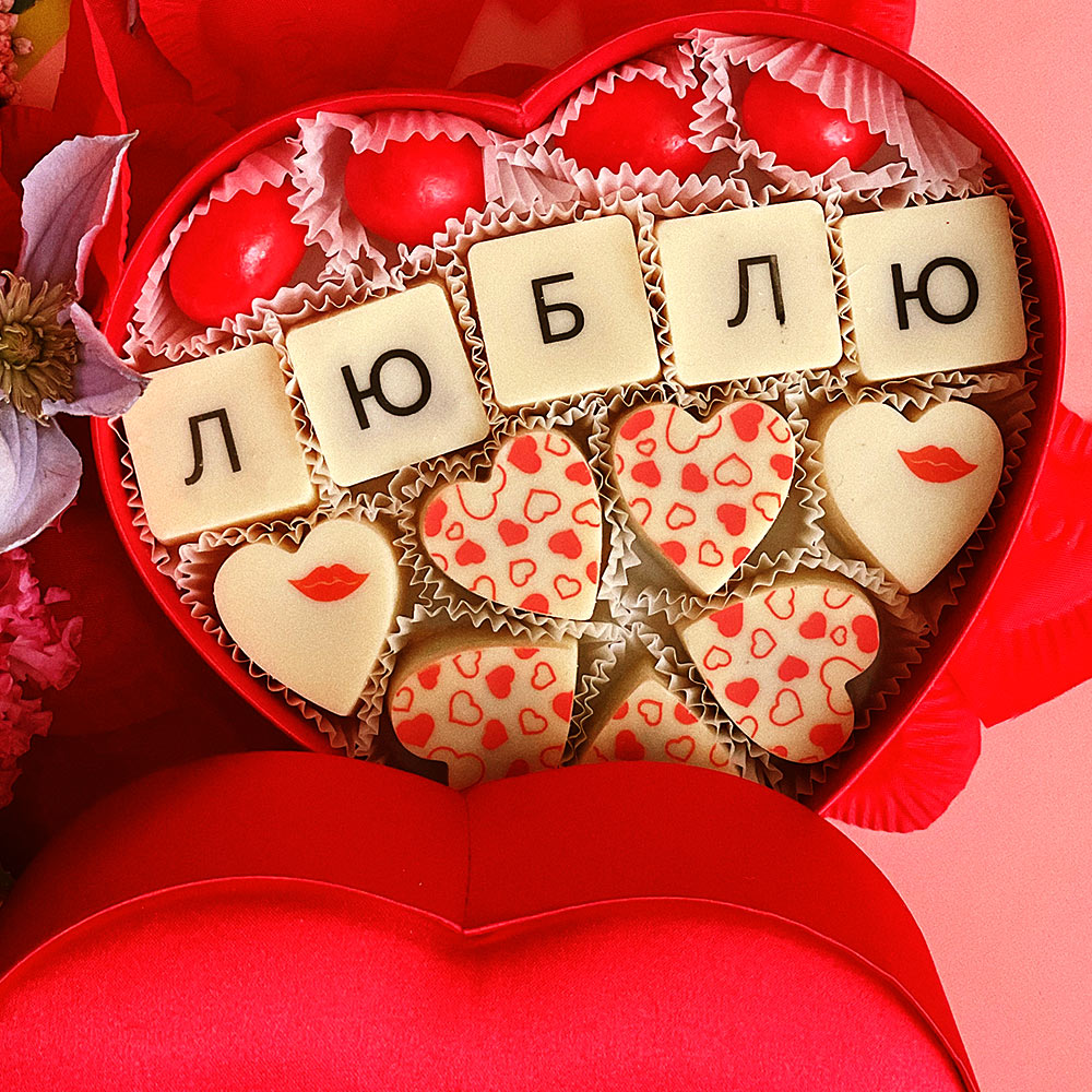 какао тертое, какао-масло, сахар, эмульгатор (лецитин соевый), ароматизатор («Ванилин»); начинки – сахар, пратока, молоко сгущенное (молоко цельное, сахар (сахароза, лактоза)), сливки сгущенные с сахаром (сливки нормализованные, сахар (сахароза), лактоза), какао-масло, какао-тертое, молоко сухое цельное, молоко сухое обезжиренное, фундук жареный тертый, ядра орехов фисташки, ядра орехов фундука, ядра орехов миндаля, натуральные концентрированные соки, масло сладко-сливочное, марципановая масса, коньяк (дистиллят коньячный, вода, сахар, натуральный пищевой краситель «карамельный колер»), спирт этиловый ректификованный, кофе натуральный молотый, ананас сушеный, папайя сушеная, консервант (сорбиновая кислота), эмульгатор (лецитин соевый), ароматизаторы, натуральные пищевые красители (комплекс меднохлорофиллов, «Карамельный колер»), декор – пищевые красители (куркумин, Е132, Е171), пищевой краситель (концентрированный сок красной свеклы, масло подсолнечное, эмульгаторы (мальтодекстрин, Е472с), регуляторы кислотности (лимонная кислота, аскорбиновая кислота))