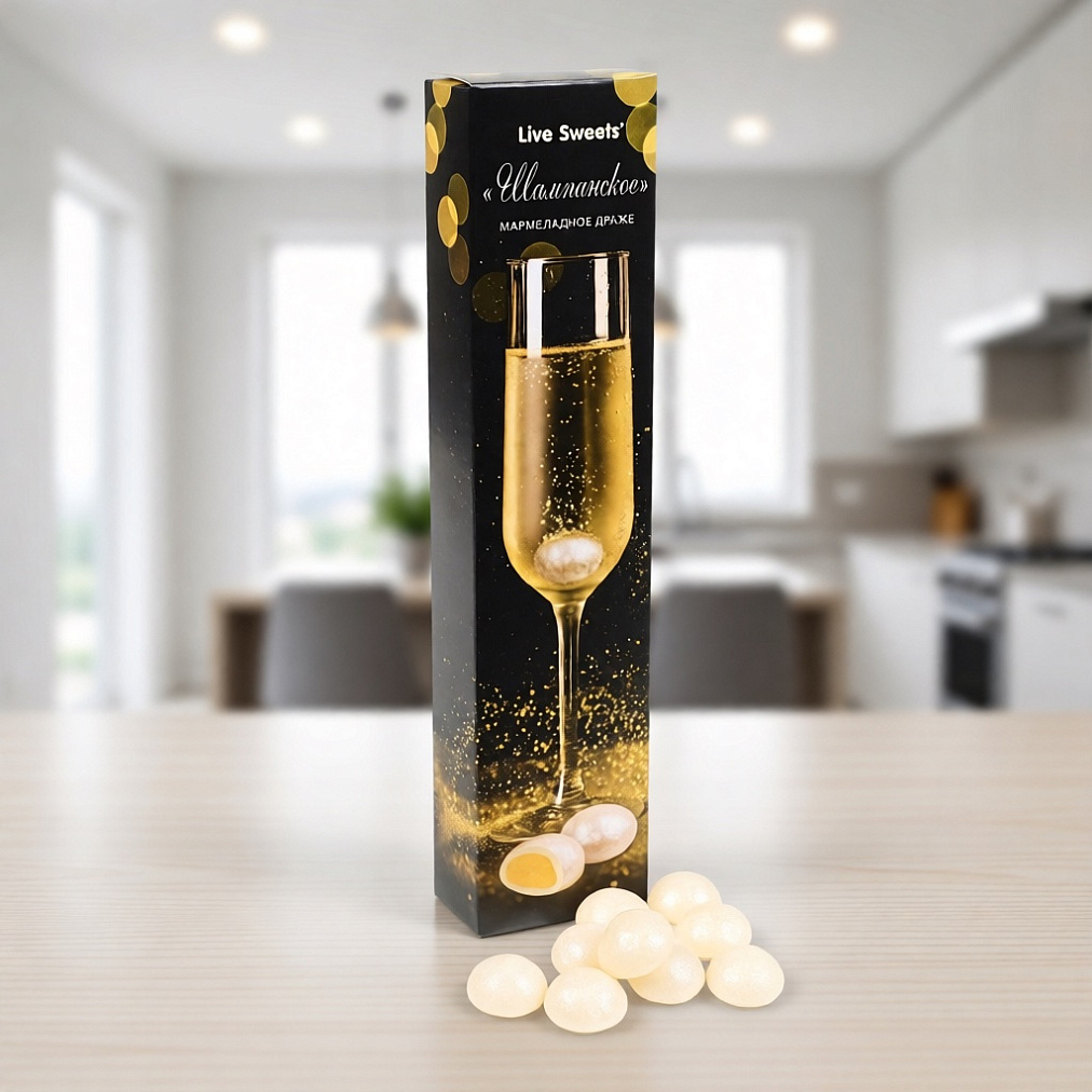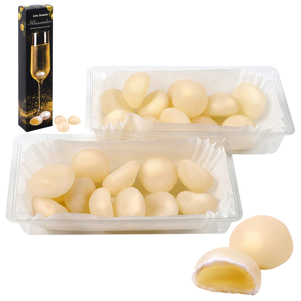 Драже мармелад желейный в сахарной глазури со вкусом шампанского. В упаковке 2 лотка с драже по 50 г.
