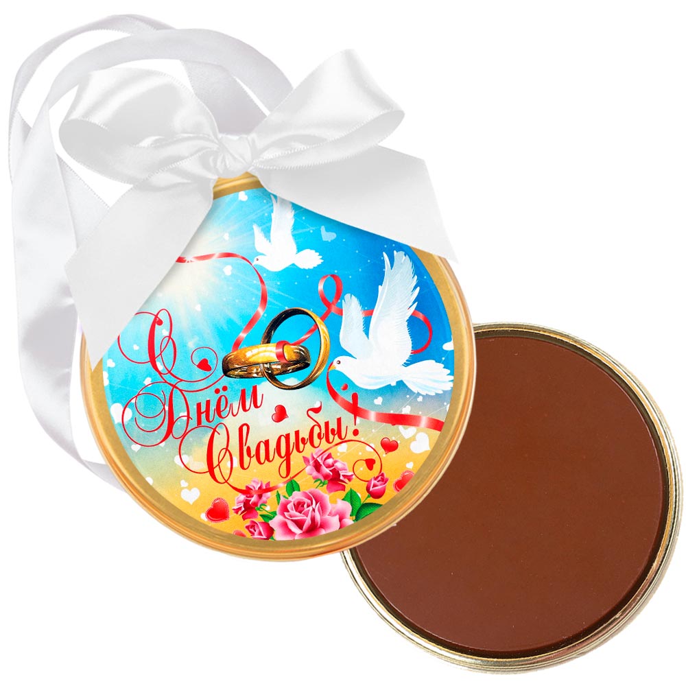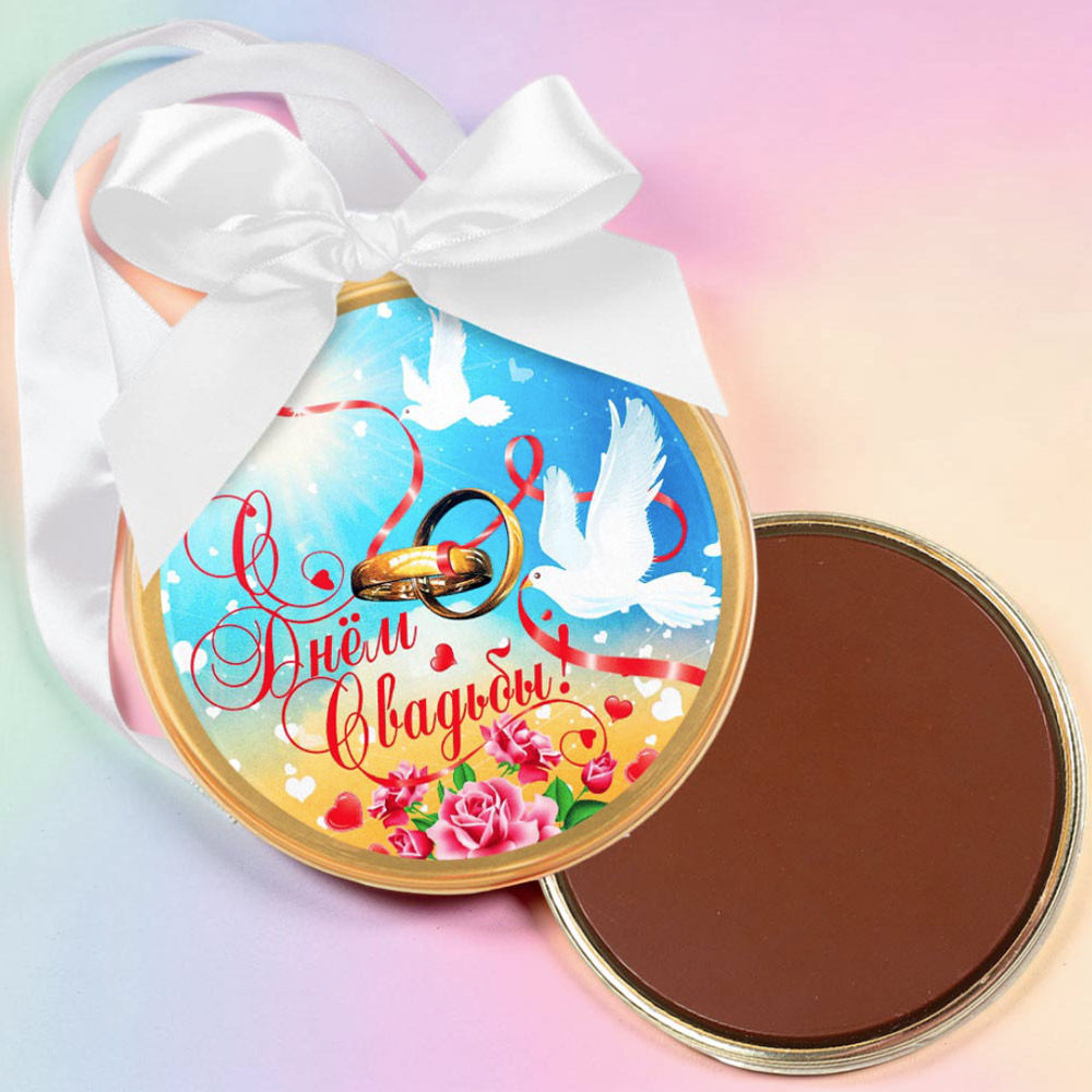 Поздравьте молодожёнов или супругов с годовщиной вкусным и трогательным подарком – медалью из нежного молочного шоколада! Это не просто сладость, а элегантный жест внимания, который подчеркнёт теплоту ваших поздравлений.