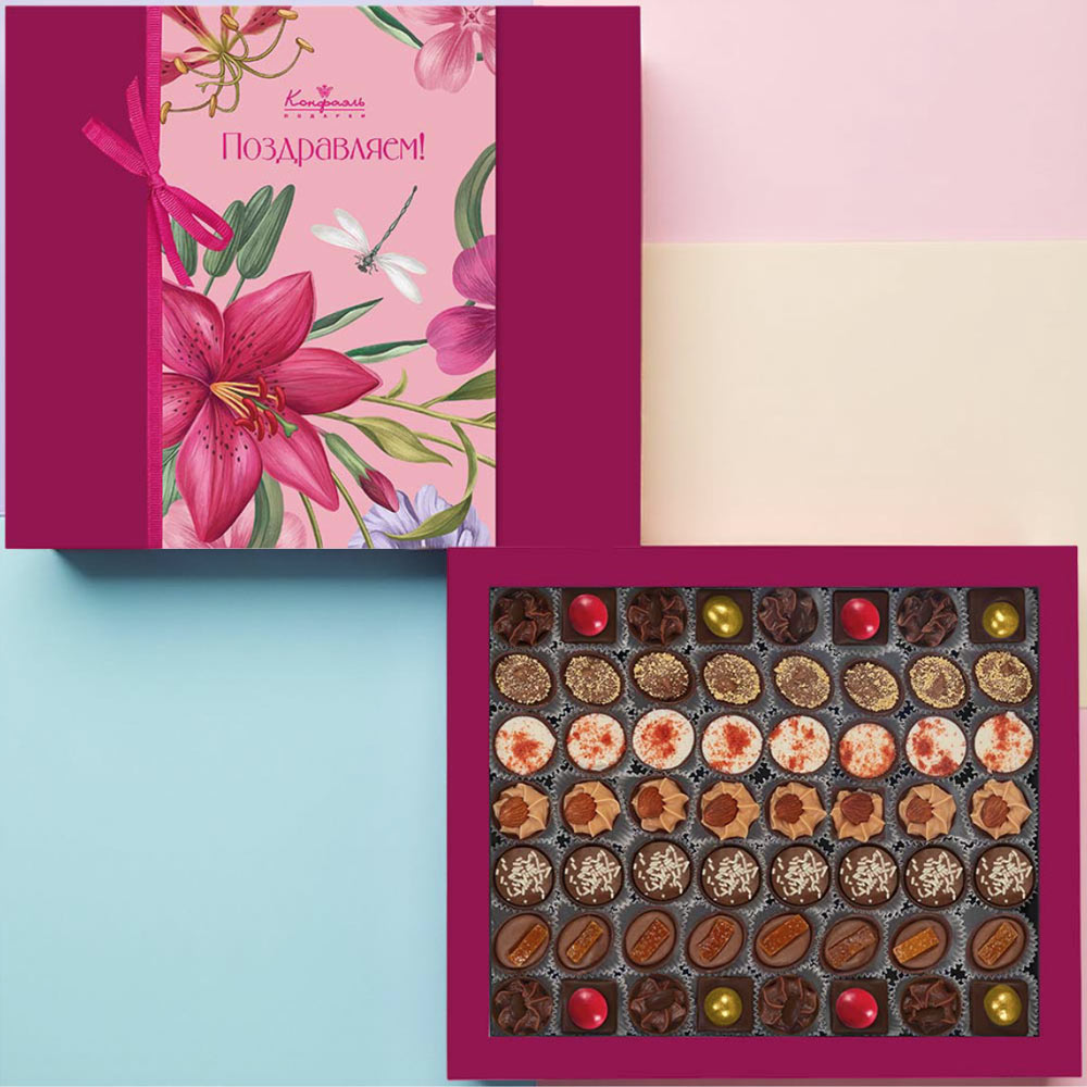 Состав: шоколад – сахар, какао тёртое, масло какао, сыворотка молочная сухая, сухое цельное молоко, эмульгатор (лецитин соевый), ароматизаторы; начинки – сахар, патока, какао-масло, какао тертое, молоко сгущенное (молоко цельное, сахар (сахароза, лактоза)), жир специального назначения (масло ши, рапсовое масло, соевое масло, антиокислитель (лимонная кислота)), молоко сухое цельное, молоко сухое обезжиренное, белый шоколад (сахар, молоко сухое цельное, масло какао, эмульгатор (лецитин соевый), ароматизатор, соль), масла растительные рафинированные дезодорированные (подсолнечное, рапсовое, оливковое; масло сладко-сливочное, молоко сухое обезжиренное), малина, ежевика, черника, брусника, пюре яблок, малина сублимированная, кранч «Апельсин», паста из кофе (кофе, растительный жир), цукаты апельсиновых корочек, ананас сушеный, клюква сушеная, ядра орехов миндаля, фундук жареный тертый, марципановая масса, соль, какао-порошок, стабилизаторы (мальтодекстрин), коньяк (дистиллят коньячный, вода, сахар, пищевой краситель (сахарный колер)), спирт этиловый ректификованный, консервант (сорбиновая кислота), антиоксидант (экстракт розмарина), загуститель (пектин), регулятор кислотности (лимонная кислота), эмульгаторы (лецитин соевый, Е471), ароматизаторы; декор – пищевые красители (кандурин золотой, кандурин красный янтарь), глазирователь (капол). Внимание! Продукция производится на предприятии, где используются арахис, кунжут, орехи, яичные и молочные продукты, злаки, содержащие глютен.