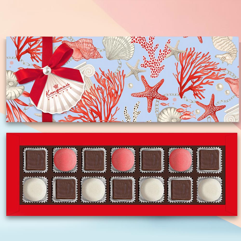 Состав: шоколад – сахар, какао тёртое, масло какао, эмульгатор (лецитин соевый), ароматизатор; начинки – сахар, патока, молоко сгущенное (молоко цельное, сахар (сахароза, лактоза)), масло сладко-сливочное, белок яичный порошкообразный, желирующий агент (агар), желатин говяжий, консервант (сорбиновая кислота), регулятор кислотности (лимонная кислота), эмульгаторы (лецитин соевый, Е471), ароматизаторы, пищевые красители ( Е171, красный свекольный, паприка). Внимание! Продукция производится на предприятии, где используются арахис, кунжут, орехи, яичные и молочные продукты, злаки, содержащие глютен.