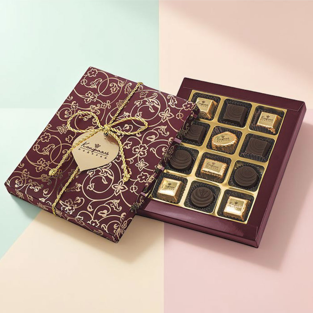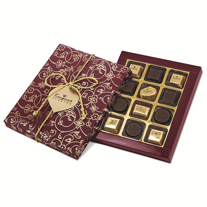 Элегантная упаковка цвета бордо с золотыми виньетками и конфеты с шоколадными и сливочными начинками, безусловно, придутся по вкусу искушенным особам.