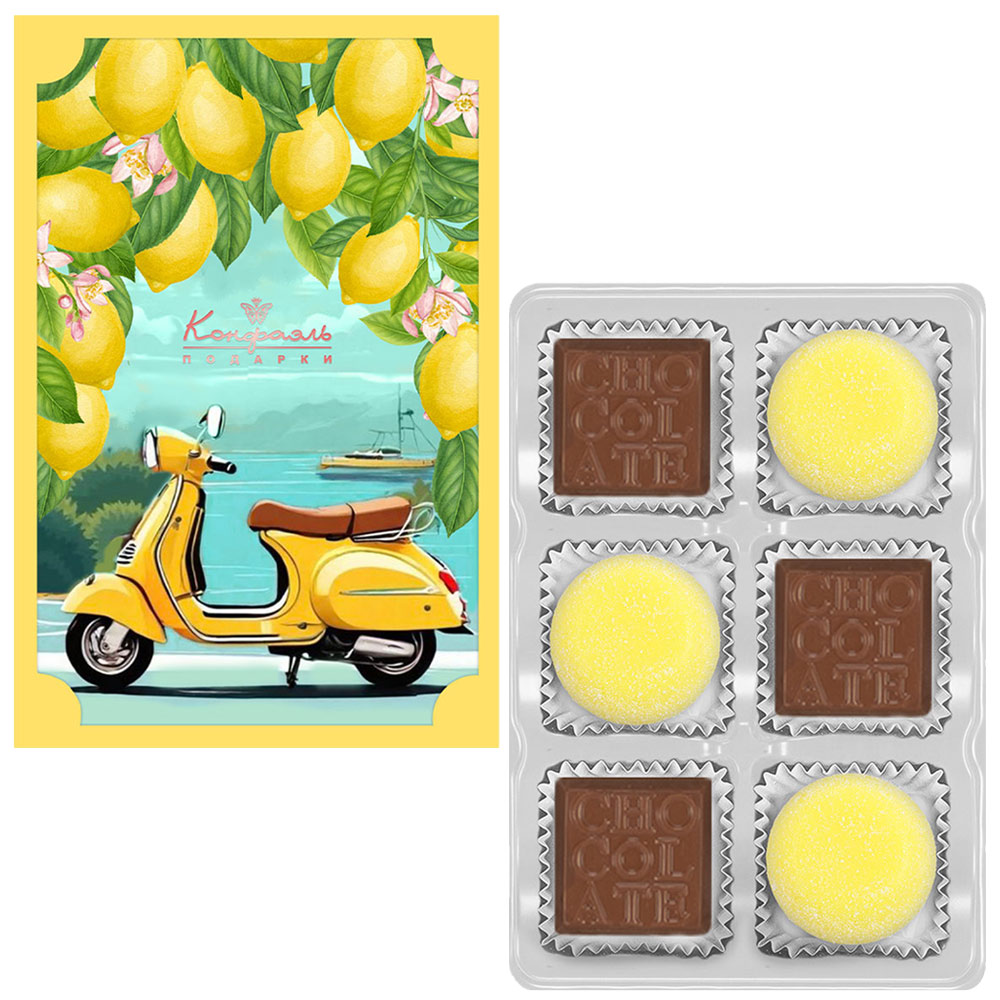 Состав: шоколад - сахар, масло какао, сыворотка молочная сухая, сухое цельное молоко, какао тёртое, эмульгатор (лецитин соевый), ароматизаторы; начинки - сахар, патока, жир специального назначения (масло ши, рапсовое масло, соевое масло, антиокислитель( лимонная кислота)), молоко сухое цельное, молоко сухое обезжиренное, белый шоколад (сахар, молоко сухое цельное, масло какао, эмульгатор (лецитин соевый), ароматизатор, соль, вафельная крошка (мука пшеничная х/п первого сорта, сахар, масло кокосовое рафинированное дезодорированное, эмульгатор (лецитин соевый), пшеничные волокна (клетчатка), ароматизатор), желирующий агент (агар), желатин говяжий, пищевые красители ( Е171, куркумин, медные комплексы хлорофиллов и хлорофиллинов).