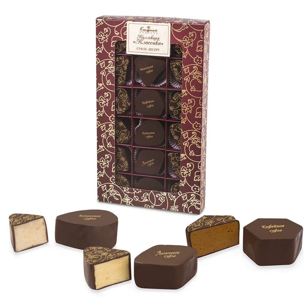 За слоем расписного шоколада прячется ещё больший сюрприз - нежнейшее суфле с разными вкусовыми оттенками.
