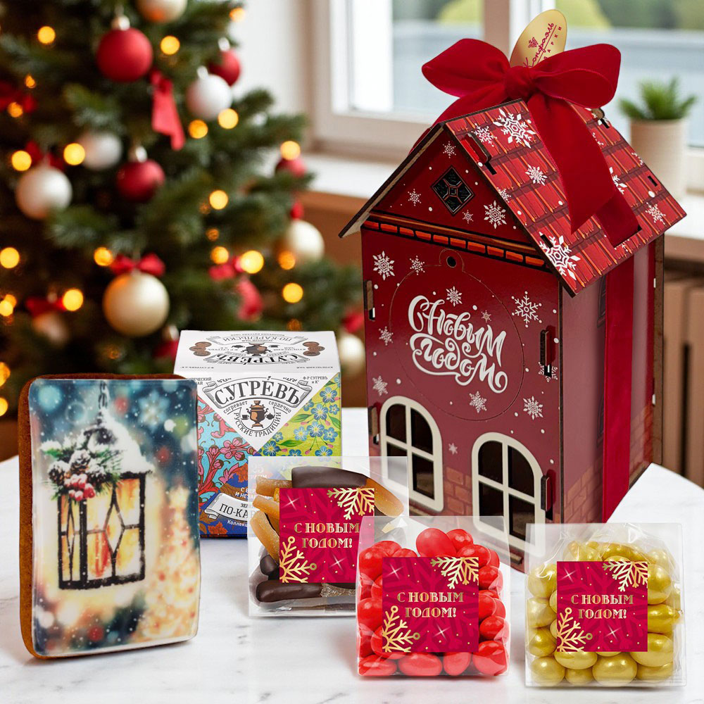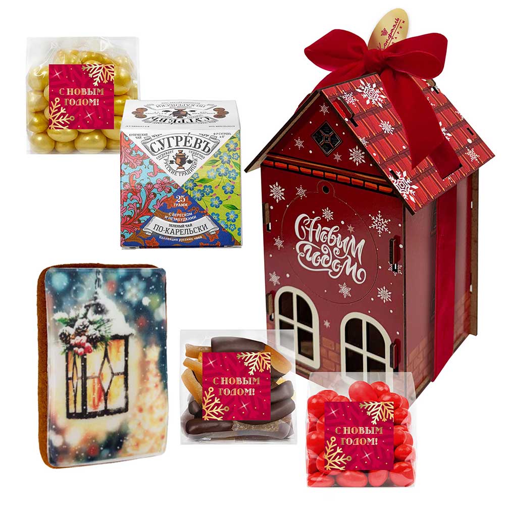 Новогодний домик с конфетами: цукаты, драже, чай 275г