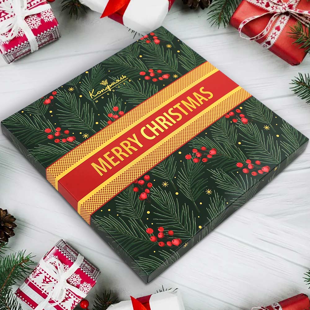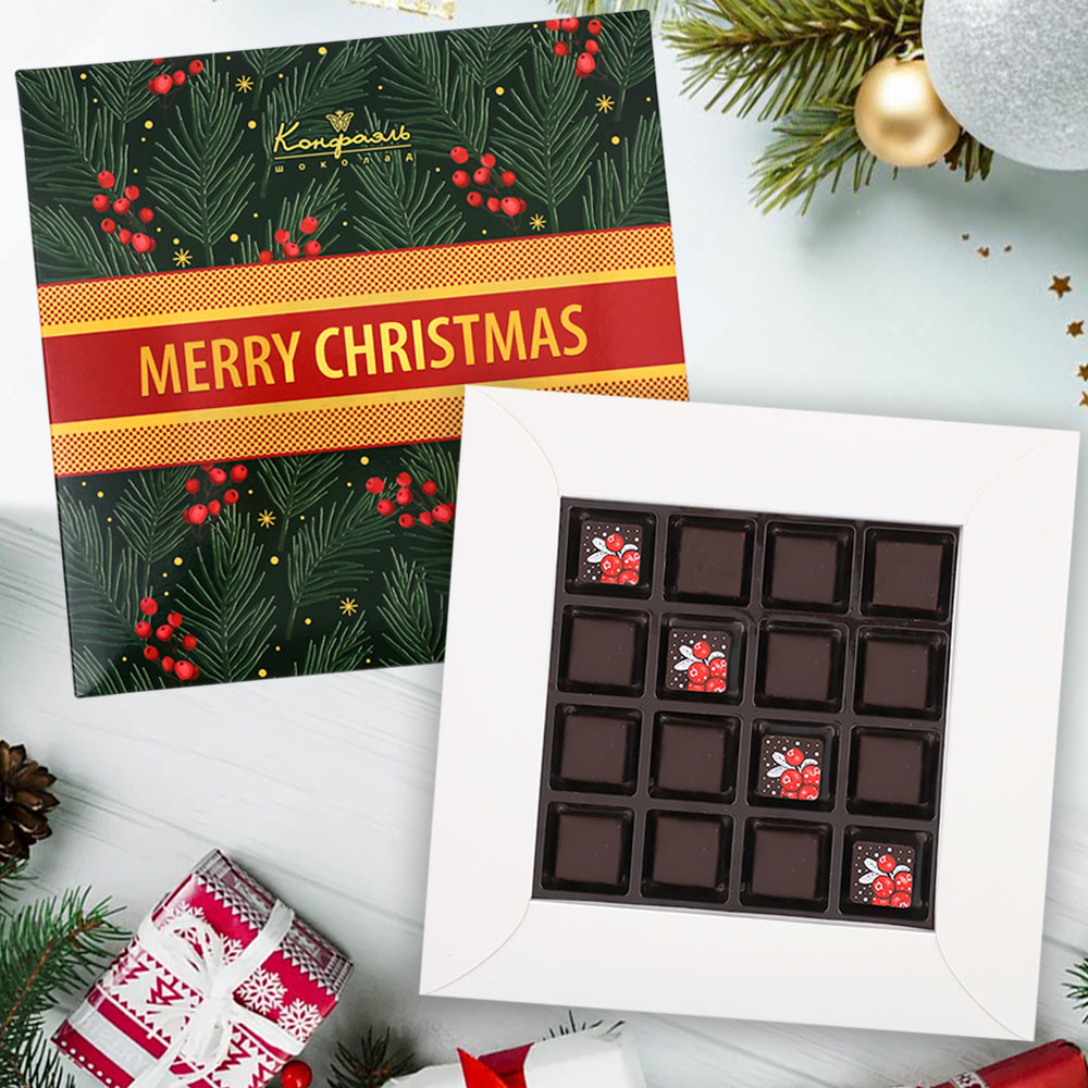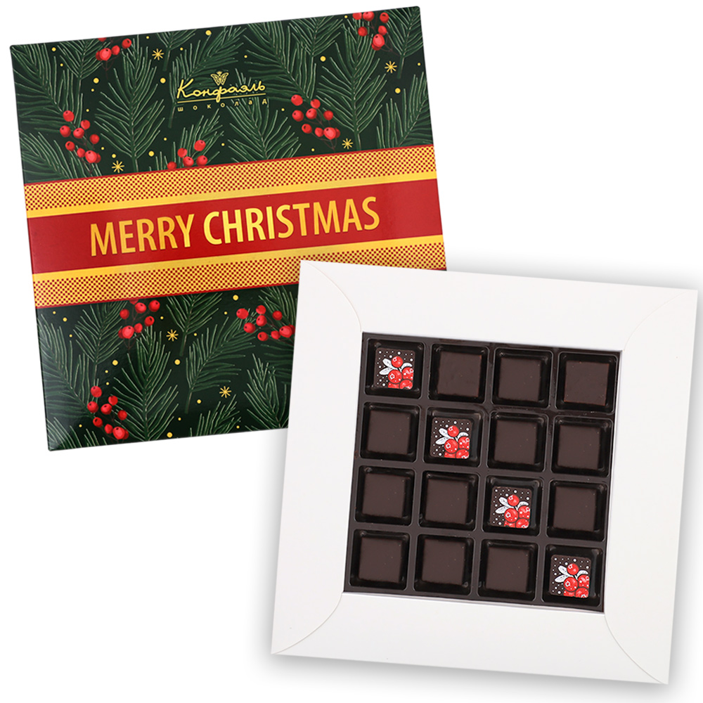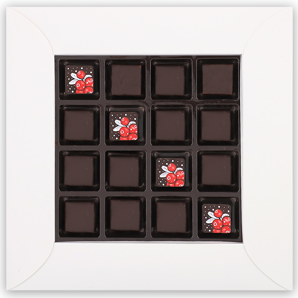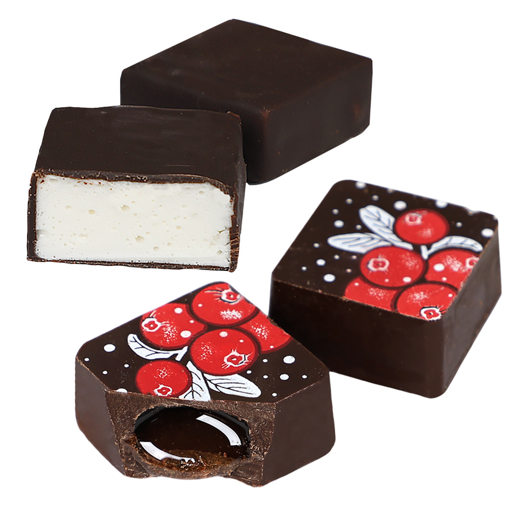 Состав: шоколадная масса - сахар, тертое какао, масло какао, какао-порошок, эмульгатор (лецитин соевый), натуральная ваниль; начинки - сахар, патока, молоко сгущенное (молоко цельное, сахар (сахароза, лактоза)), масло сладко - сливочное, белок яичный порошкообразный, натуральный концентрированный клюквенный сок, стабилизатор (гуммиарабик), желирующий агент (агар), спирт этиловый ректификованный, консервант (сорбиновая кислота), регулятор кислотности (лимонная кислота), экстракт ванили, ароматизатор; декор - пищевые красители (Е171, свекольный концентрат)