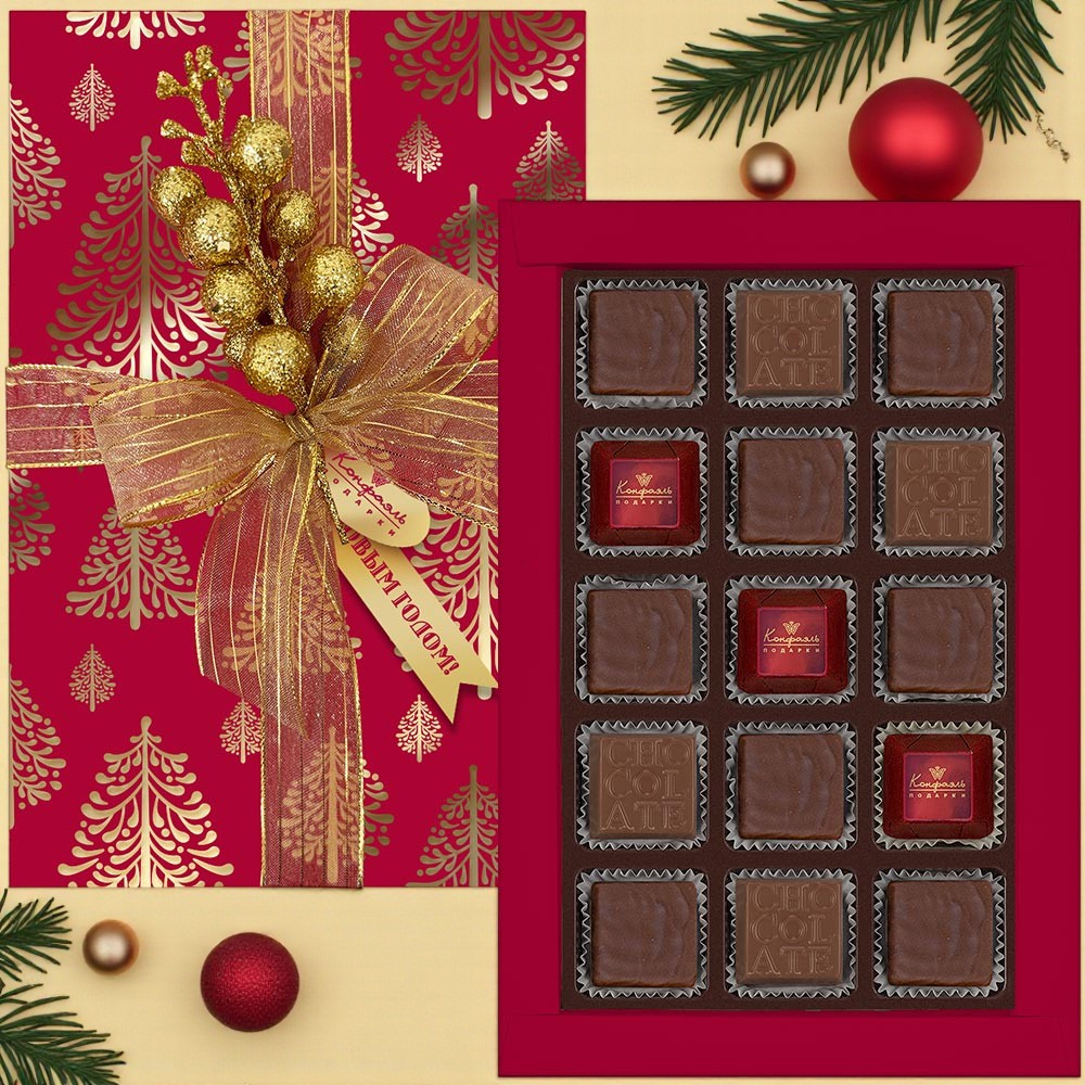 Состав: шоколадные массы - сахар, тертое какао, какао-порошок, масло какао, сыворотка молочная сухая, сухое цельное молоко, молочный жир, паста ореховая из ядер фундука, эмульгаторы (лецитин соевый, Е476), соль, натуральная ваниль; начинки - сахар, патока крахмальная карамельная, молоко сгущенное (молоко цельное, сахар (сахароза, лактоза)), молоко сухое цельное, молоко сухое обезжиренное, масла растительные рафинированные дезодорированные (подсолнечное, рапсовое, оливковое; масло сливочное, молоко сухое обезжиренное), масло сладко-сливочное, жир специального назначения (масло ши, рапсовое масло, соевое масло), белок яичный, вафельная крошка (мука пшеничная х/п первого сорта, сахар, масло кокосовое рафинированное дезодорированное, эмульгатор (лецитин соевый), пшеничные волокна (клетчатка), ароматизатор), стабилизатор (мальтодекстрин), желирующий агент (агар), коньяк (дистиллят коньячный, вода, сахар, пищевой краситель «Сахарный колер»), консервант (сорбиновая кислота), регулятор кислотности (лимонная кислота), эмульгаторы (лецитин соевый, Е471), ароматизаторы, пищевые красители «Сахарный колер».