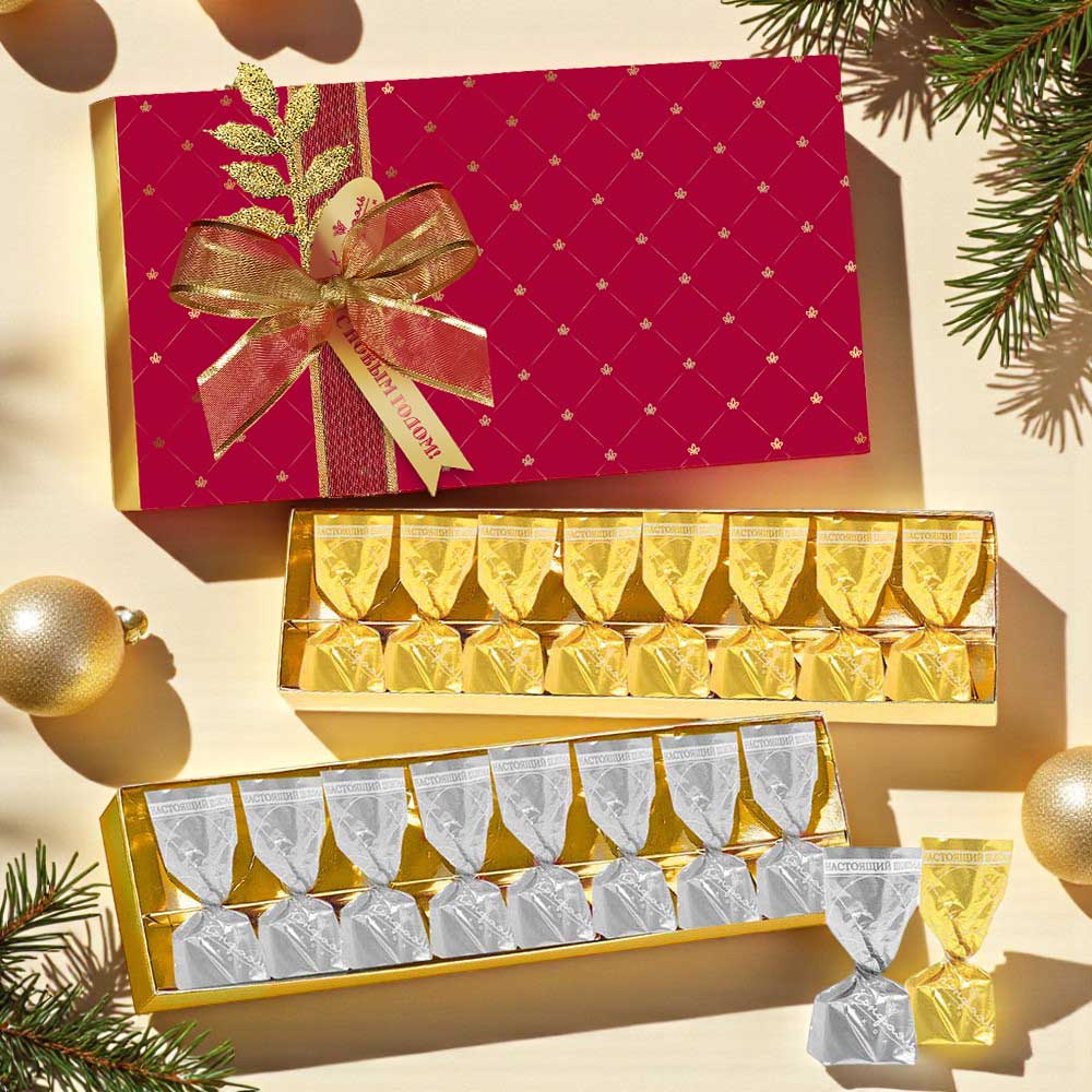 Состав: шоколадная масса – сахар, какао-масло, какао тертое, сыворотка молочная сухая, лактоза, молоко сухое цельное, молоко сухое обезжиренное, эмульгатор (лецитин соевый), ароматизатор («Ванилин»); начинки сахар, патока, какао-масло, какао тертое, молоко сгущенное (молоко цельное, сахар (сахароза, лактоза)), ядра орехов миндаля, стабилизатор (мальтодекстрин), коньяк (дистиллят коньячный, вода, сахар, пищевой краситель «Сахарный колер»), спирт этиловый ректификованный, консервант (сорбиновая кислота), регулятор кислотности (лимонная кислота), эмульгаторы (лецитин соевый, Е471), ароматизаторы. Продукция производится на предприятии, где используются арахис, кунжут, орехи, яичные и молочные продукты, злаки, содержащие глютен.