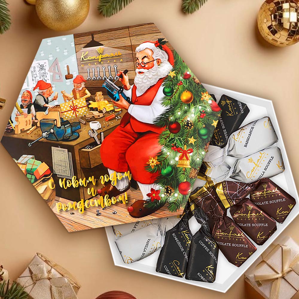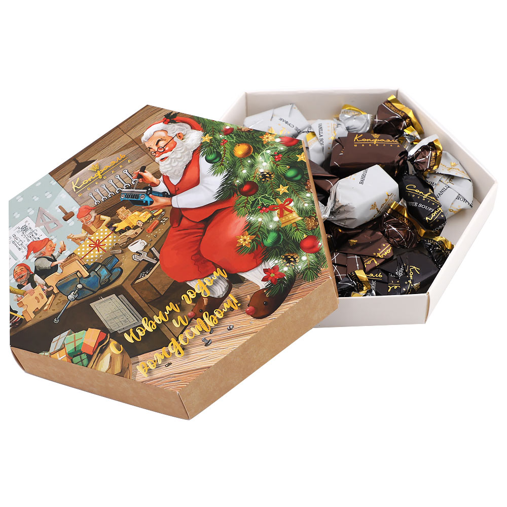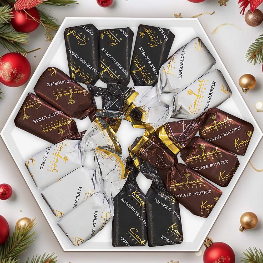 Состав: шоколадная масса -сахар, какао тертое, масло какао, какао-порошок, эмульгаторы (соевый лецитин, Е476); начинки - сахар, патока, молоко сгущенное (молоко цельное, сахар (сахароза, лактоза)), масло сладко-сливочное, белок яичный, желирующий агент (агар), регулятор кислотности (кислота лимонная), консервант (сорбиновая кислота), эмульгатор (Е471), какао-порошок, кофе натуральный молотый, экстракт ванили, ароматизаторы, пищевой краситель (сахарный колер).