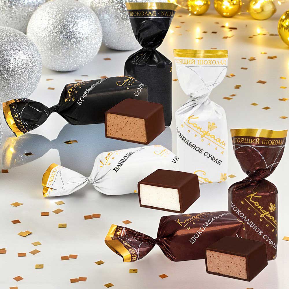 Подарок 014 / Конфеты «Суфле» в горьком шоколаде (ванильное, шоколадное, кофейное) / 80 г