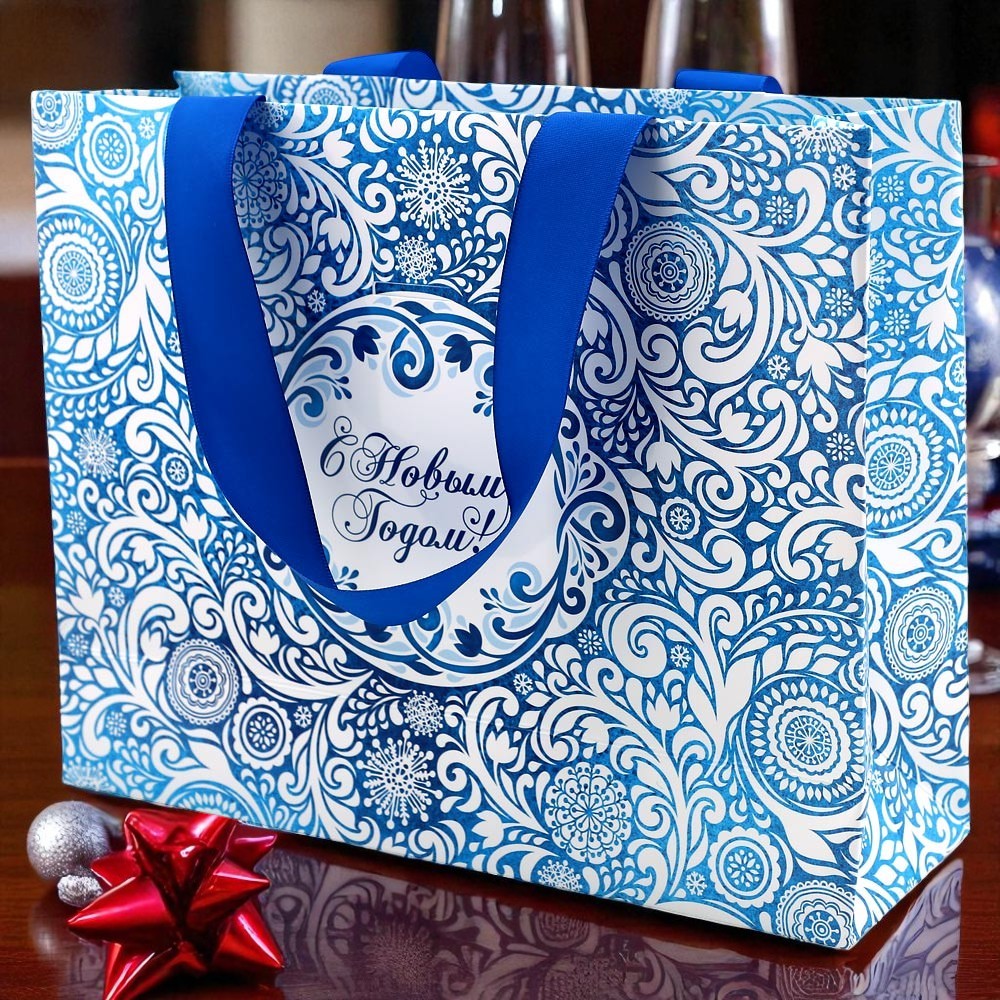 Выбираете стильное оформление подарков к празднику? Тогда ваш идеальный вариант — элегантный новогодний подарочный пакет белого цвета с нежным синим узором!