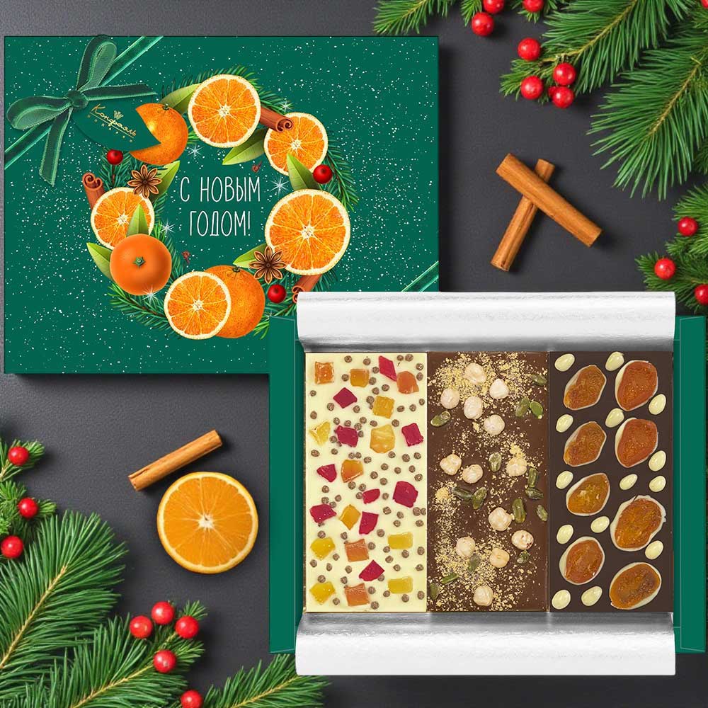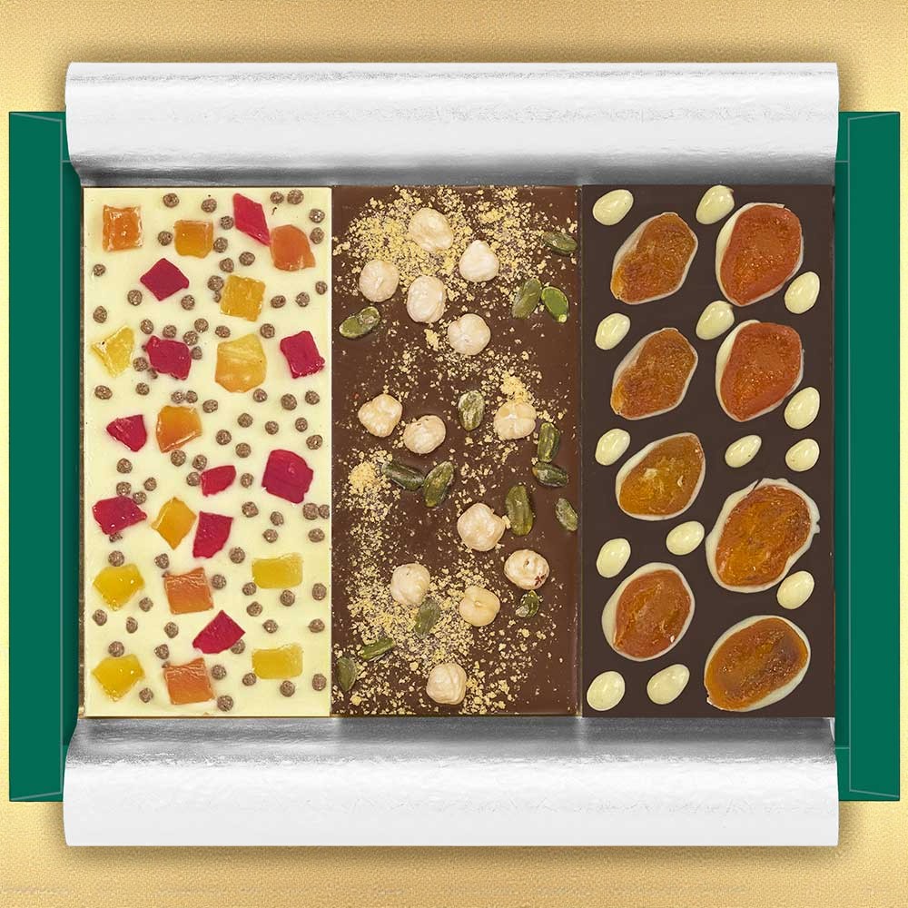 Шоколад молочный с фундуком, фисташками и апельсиновыми кранчами. Шоколад белый с цукатами папайи и рисовыми шоколадными шариками. Шоколад горький с кумкватом и драже «Кедр» в белом шоколаде
