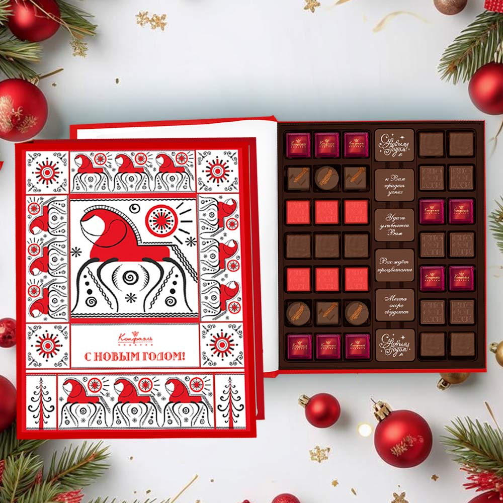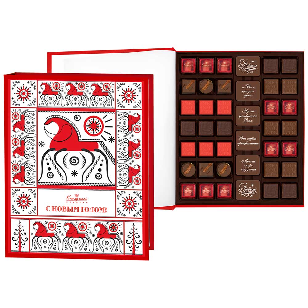Состав: шоколадные массы - сахар, масло какао, молоко цельное сухое, сухое обезжиренное молоко, какао тертое, какао-порошок, сыворотка молочная сухая, пахта сухая, молочный жир, паста ореховая из ядер фундука, эмульгаторы (соевый лецитин, Е476), соль, натуральная ваниль, ароматизаторы; начинки - сахар, патока, молоко сгущенное (молоко цельное, сахар (сахароза, лактоза)), масла растительные рафинированные дезодорированные (подсолнечное, рапсовое, оливковое; масло сладко-сливочное, молоко сухое обезжиренное), масло сладко - сливочное, жир специального назначения (масло ши, рапсовое масло, соевое масло, антиокислитель( лимонная кислота)), вафельная крошка( мука пшеничная х/п первого сорта, сахар, масло кокосовое рафинированное дезодорированное, эмульгатор( лецитин соевый), пшеничные волокна (клетчатка), ароматизатор), молоко сухое цельное, молоко сухое обезжиренное, белый шоколад (сахар, масло какао, сухое обезжиренное молоко, сухое цельное молоко, эмульгатор (лецитин соевый), экстракт ванили), белок яичный порошкообразный, стабилизатор (мальтодекстрин), желирующий агент (агар), коньяк (дистиллят коньячный, вода, сахар, пищевой краситель (сахарный колер)), консервант (сорбиновая кислота), регулятор кислотности (лимонная кислота), эмульгаторы (лецитин соевый, Е471), сухой сок ананаса, ароматизаторы, пищевые красители (сахарный колер, куркумин, красный свекольный, медные комплексы хлорофиллов и хлорофиллинов); декор - пищевые красители (Е171).