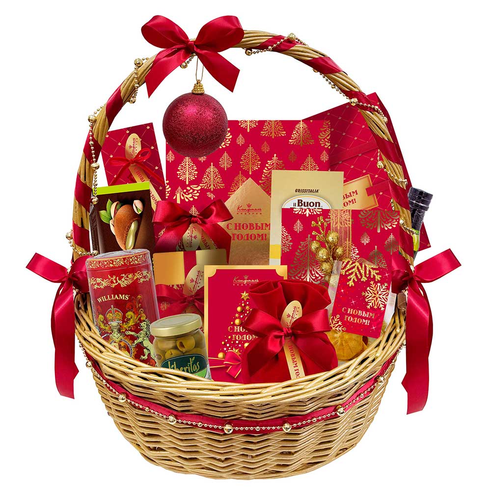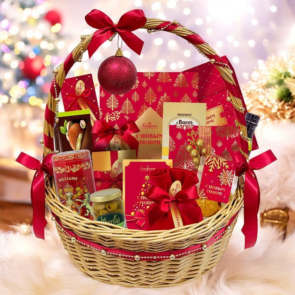 "Новогодняя корзина": драже, конфеты, чай, печенье, мед, фруктовые чипсы 2705г