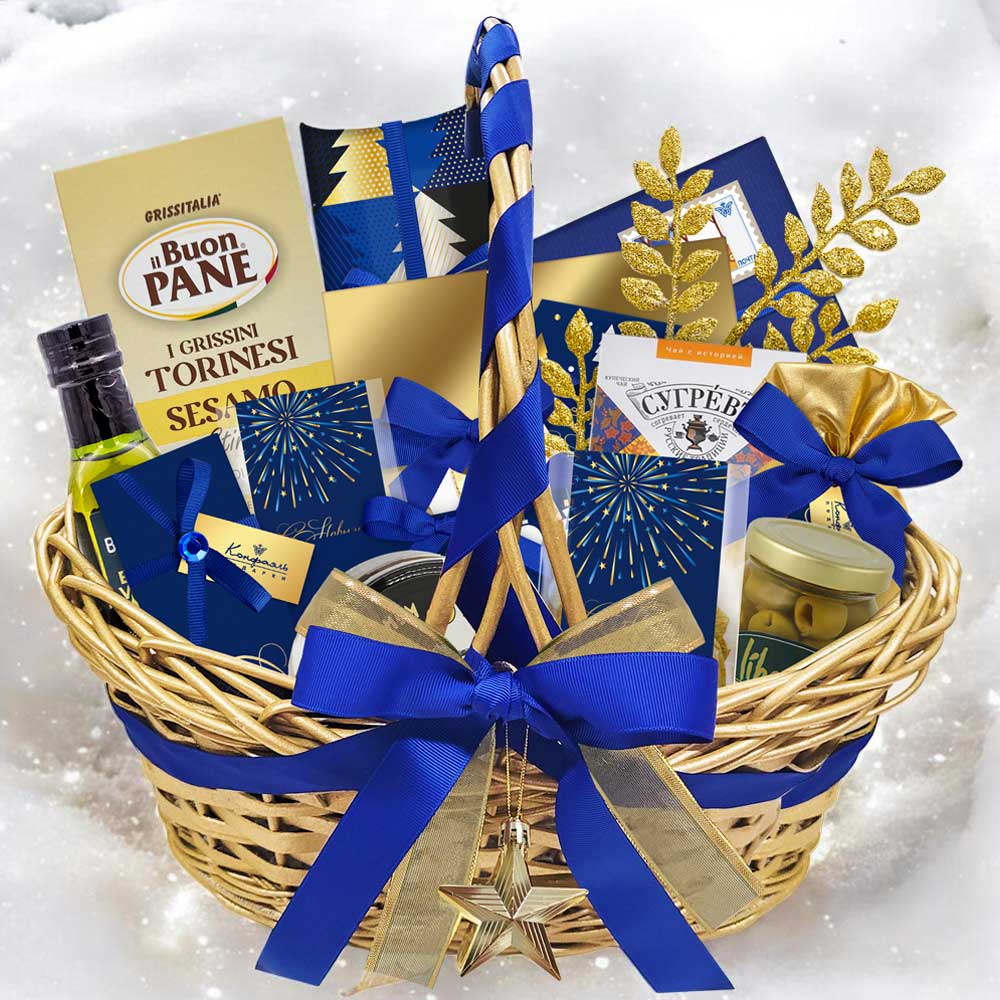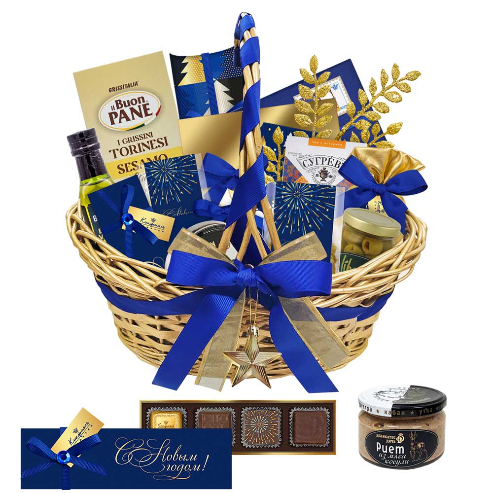 "Новогодняя корзина" набор: конфеты ассорти, молочный шоколад, драже, фруктовые чипсы, оливковое масло, хлебные палочки, риет, чай, мед