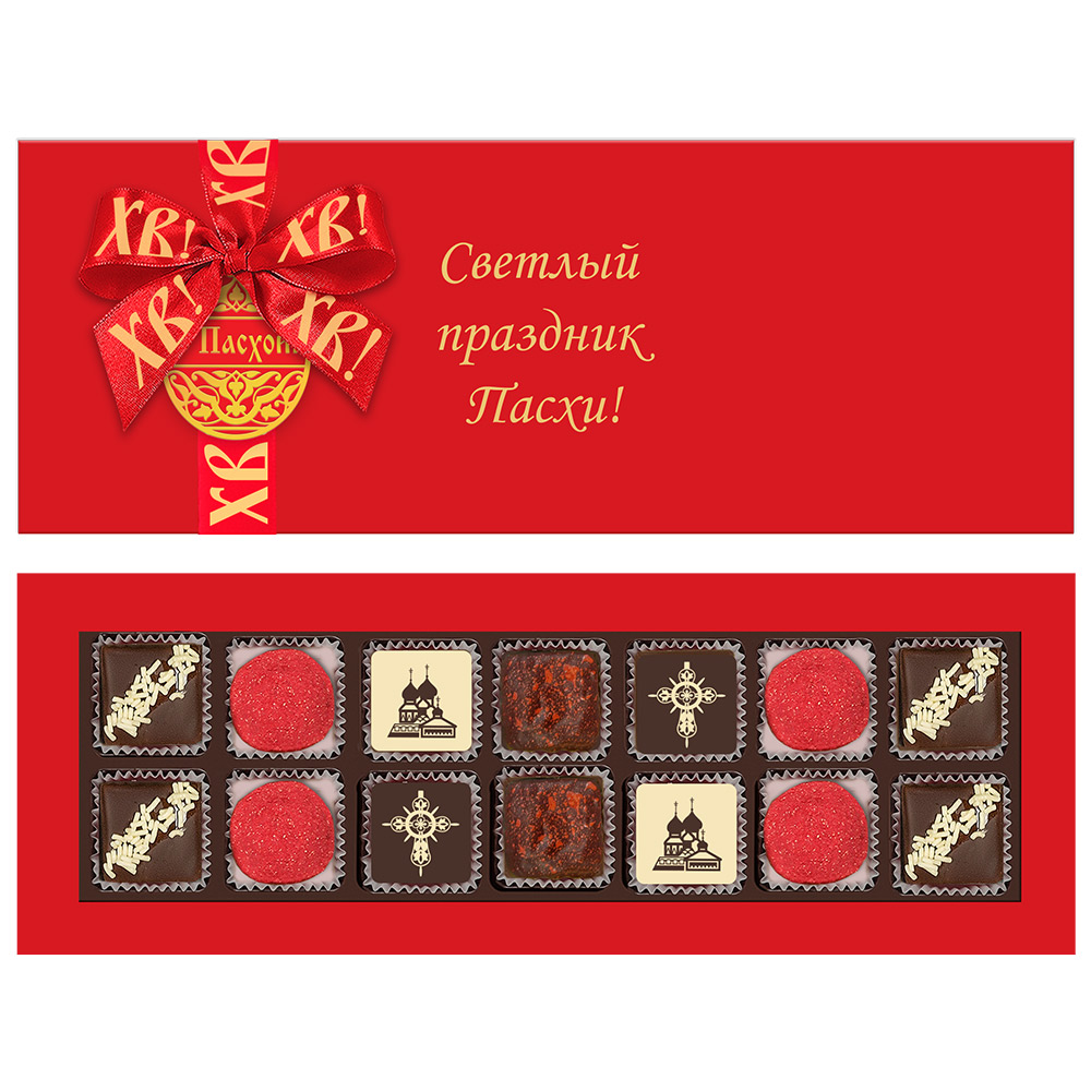Состав: шоколадные массы – сахар, тертое какао, какао-порошок, масло какао, сухое обезжиренное молоко, сухое цельное молоко, пахта сухая, эмульгатор (лецитин соевый), соль, натуральная ваниль; начинки – сахар, патока, какао-масло, какао тертое, молоко сгущенное (молоко цельное, сахар (сахароза, лактоза)), масла растительные рафинированные дезодорированные (подсолнечное, рапсовое, оливковое; масло сладко-сливочное, молоко сухое обезжиренное), натуральный концентрированный сок малины, пюре малины, пюре манго, пюре маракуйи, малина сублимированная, ядра орехов миндаля, ядра орехов фисташки, марципановая масса, соль, какао-порошок, стабилизатор (мальтодекстрин), коньяк (дистиллят коньячный, вода, сахар, пищевой краситель (сахарный колер)), консервант (сорбиновая кислота), регулятор кислотности (лимонная кислота), эмульгаторы (лецитин соевый, Е471), ароматизаторы, пищевой краситель (сахарный колер); декор – пищевые красители (Е172, Е171, кандурин красный янтарь). Продукция производится на предприятии, где используются арахис, кунжут, орехи, яичные и молочные продукты, злаки, содержащие глютен