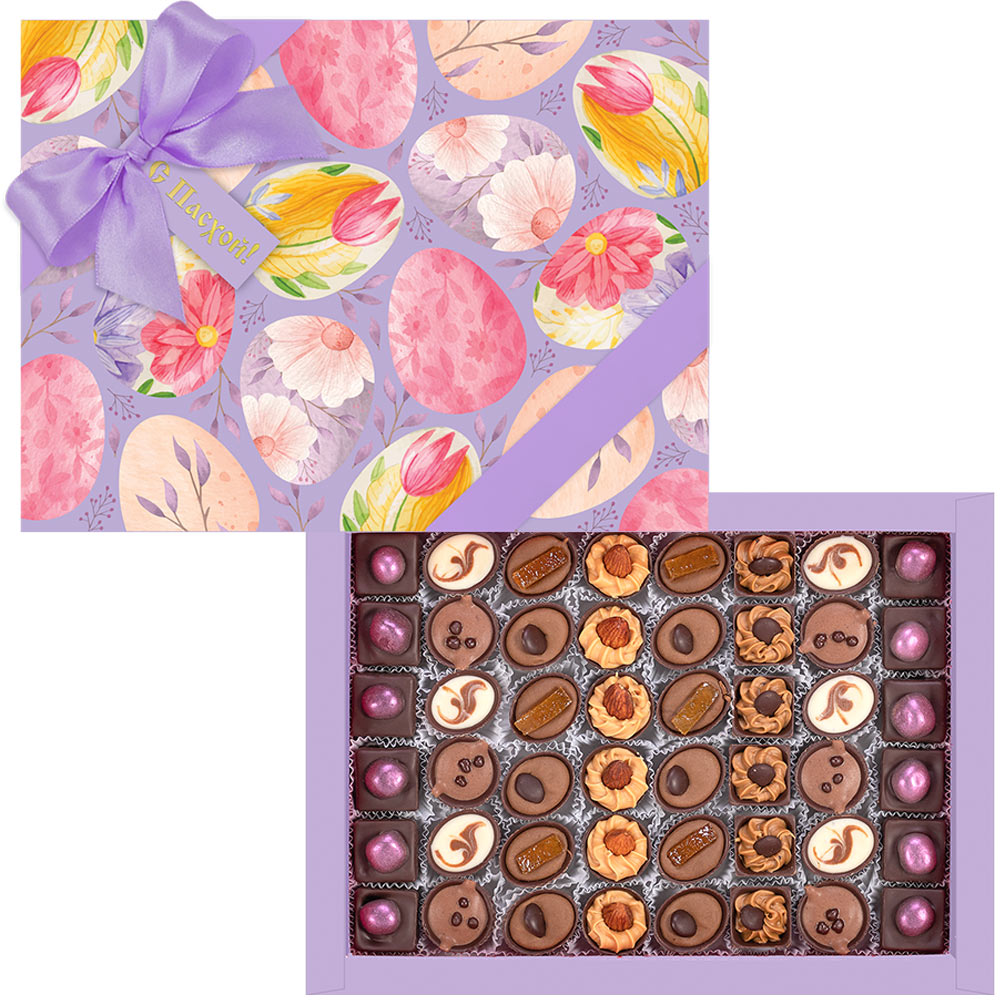 Состав: шоколадные массы – какао тертое, какао-масло, сахар, эмульгатор (лецитин соевый), ароматизатор («Ванилин»), начинки – сахар, патока, глюкоза, фруктоза, какао-масло, какао тертое, молоко сухое цельное, молоко сухое обезжиренное, рафинированные дезодорированные растительные масла, паста из кофе (кофе, растительный жир), цукаты апельсиновых корочек, ананас сушеный, какао-крупка, ядра орехов миндаля, фундук жареный тертый, марципановая масса, кофе натуральный молотый, стабилизатор (мальтодекстрин), лактоза, коньяк (дистиллят коньячный, вода, сахар, натуральный пищевой краситель «Карамельный колер»), спирт этиловый ректификованный, консервант (сорбиновая кислота), регулятор кислотности (лимонная кислота), эмульгаторы (лецитин соевый, Е471), ароматизаторы, натуральный пищевой краситель «Карамельный колер», декор – пищевой краситель (кандурин сиреневый), глазирователь (капол).
