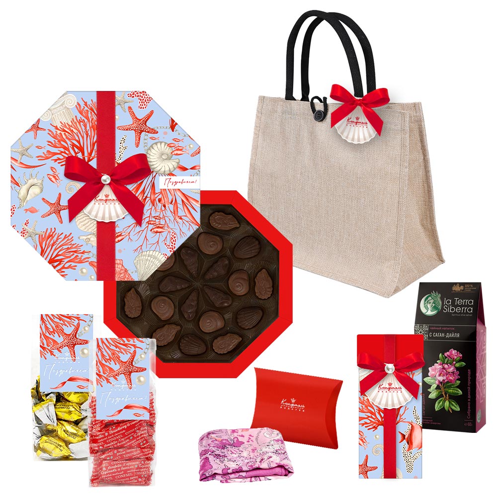Подарочная сумка-шоппер: мармелад, шоколадные конфеты ассорти, чай