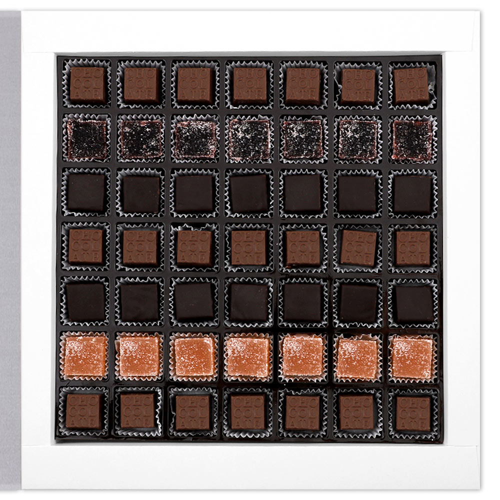 Состав: шоколад – сахар, какао тёртое, масло какао, сыворотка молочная сухая, сухое цельное молоко, эмульгатор (лецитин соевый), ароматизаторы; начинки – сахар, патока, какао-масло, какао тертое, молоко сгущенное (молоко цельное, сахар (сахароза, лактоза)), масло сладко-сливочное, белок яичный порошкообразный, натуральные концентрированный сок клубники, слива свежая, стабилизатор (мальтодекстрин), желирующий агент (агар), желатин говяжий, коньяк (дистиллят коньячный, вода, сахар, пищевой краситель (сахарный колер)), спирт этиловый ректификованный, консервант (сорбиновая кислота), регулятор кислотности (лимонная кислота), эмульгаторы (лецитин соевый, Е471), экстракт ванили, ароматизаторы.