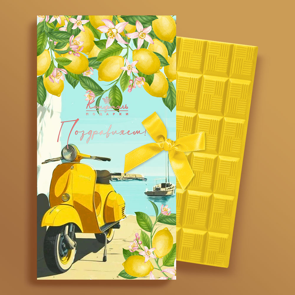 Состав: шоколад - сахар, молоко сухое цельное, масло какао, эмульгатор (лецитин соевый), соль, экстракт лимона ароматизаторы, пищевой краситель куркумин.
