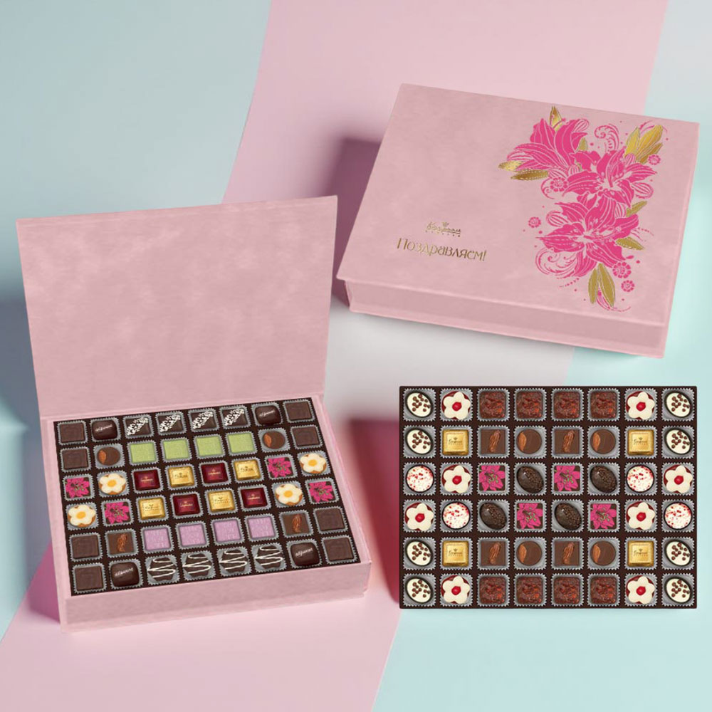Состав: шоколад- сахар, масло какао, сыворотка молочная сухая, сухое цельное молоко, какао тёртое, эмульгатор (лецитин соевый), ароматизаторы, соль; начинки - сахар, патока, какао-масло, какао тертое, молоко сгущенное (молоко цельное, сахар (сахароза, лактоза)), масла растительные рафинированные дезодорированные (подсолнечное, рапсовое, оливковое; масло сладко-сливочное, молоко сухое обезжиренное), жир специального назначения (масло ши, рапсовое масло, соевое масло, антиокислитель( лимонная кислота)), молоко сухое цельное, молоко сухое обезжиренное, белый шоколад (сахар, молоко сухое цельное, масло какао, эмульгатор (лецитин соевый), ароматизатор, соль), масло сладко - сливочное, белок яичный порошкообразный, натуральные концентрированные соки (апельсин, вишня), клубника сушеная, кумкват сушеный, пюре манго, пюре маракуйи, малина, ежевика, черника, брусника, пюре яблок, малина сублимированная, рис воздушный с какао (крупа рисовая, сахар, какао, соль), цукаты лимонных корочек, папайя сушеная, ананас сушеный, финики, слива свежая, абрикос свежий, ядра орехов фундука, ядра орехов миндаля, марципановая масса, какао-порошок, стабилизаторы (мальтодекстрин), желирующий агент (агар), желатин говяжий, коньяк (дистиллят коньячный, вода, сахар, пищевой краситель (сахарный колер)), спирт этиловый ректификованный, консервант (сорбиновая кислота), регулятор кислотности (лимонная кислота), антиокидант (экстракт розмарина), загуститель (пектин), эмульгаторы (лецитин соевый, Е471), чай Матча, экстракт лаванды, ароматизаторы, пищевые красители (сахарный колер, сухой сок черники, красный свекольный, куркумин); декор - пищевые красители (Е171, красный свекольный, медные комплексы хлорофиллов и хлорофиллинов, кандурин красный янтарь). Внимание! В продукте возможно наличие фрагментов фруктовых косточек (кураги натуральной, фиников натуральных, чернослива натурального). Продукция производится на предприятии, где используются арахис, кунжут, орехи, яичные и молочные продукты, злаки, содержащие глютен