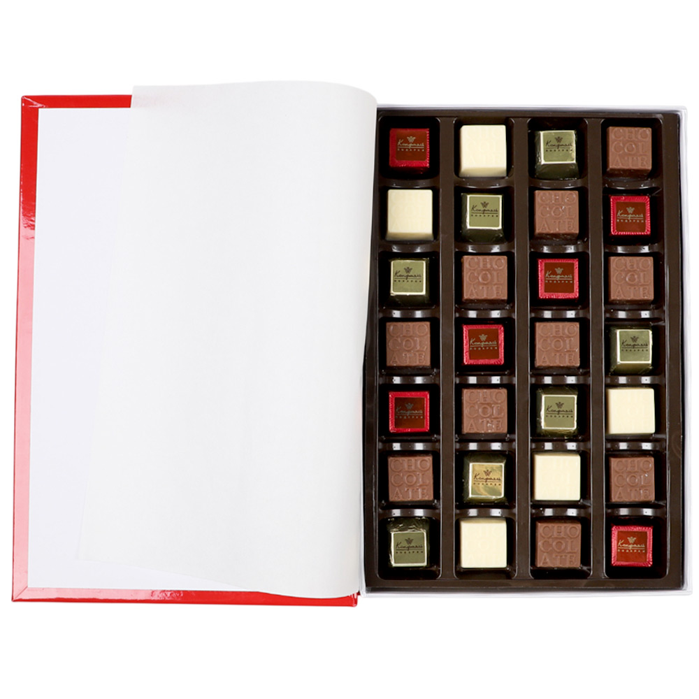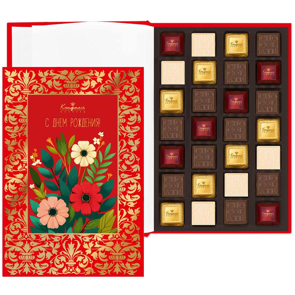 Cостав: шоколадные массы – сахар, масло какао, молоко цельное сухое, сухое обезжиренное молоко, какао тертое, какао-порошок, сыворотка молочная сухая, пахта сухая, молочный жир, паста ореховая из ядер фундука, эмульгаторы (соевый лецитин, Е476), соль, натуральная ваниль, ароматизаторы; начинки – сахар, патока, какао-масло, какао тертое, молоко сгущенное (молоко цельное, сахар (сахароза, лактоза)), жир специального назначения (масло ши, рапсовое масло, соевое масло, антиокислитель (лимонная кислота)), молоко сухое цельное, молоко сухое обезжиренное, белый шоколад (сахар, масло какао, сухое обезжиренное молоко, сухое цельное молоко, эмульгатор (лецитин соевый), экстракт ванили), масла растительные рафинированные дезодорированные (подсолнечное, рапсовое, оливковое; масло сладко-сливочное, молоко сухое обезжиренное), стабилизатор (мальтодекстрин), коньяк (дистиллят коньячный, вода, сахар, пищевой краситель (сахарный колер)), консервант (сорбиновая кислота), регулятор кислотности (лимонная кислота), эмульгаторы (лецитин соевый, Е471), ароматизаторы, пищевые красители (сахарный колер)