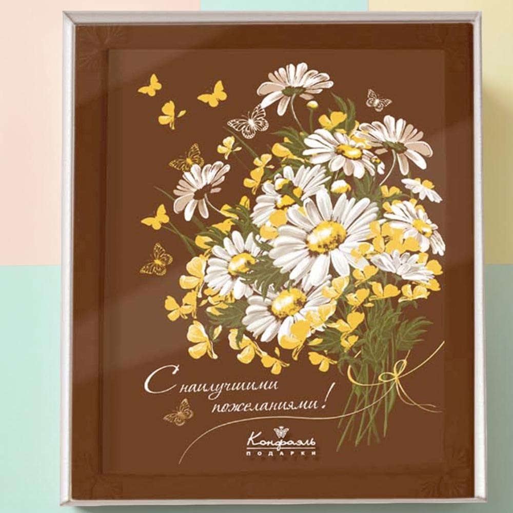 Молочный шоколад-открытка в праздничной коробке, украшенный нежными цветами и надписью-пожеланием всего наилучшего - уместный презент по любому поводу.