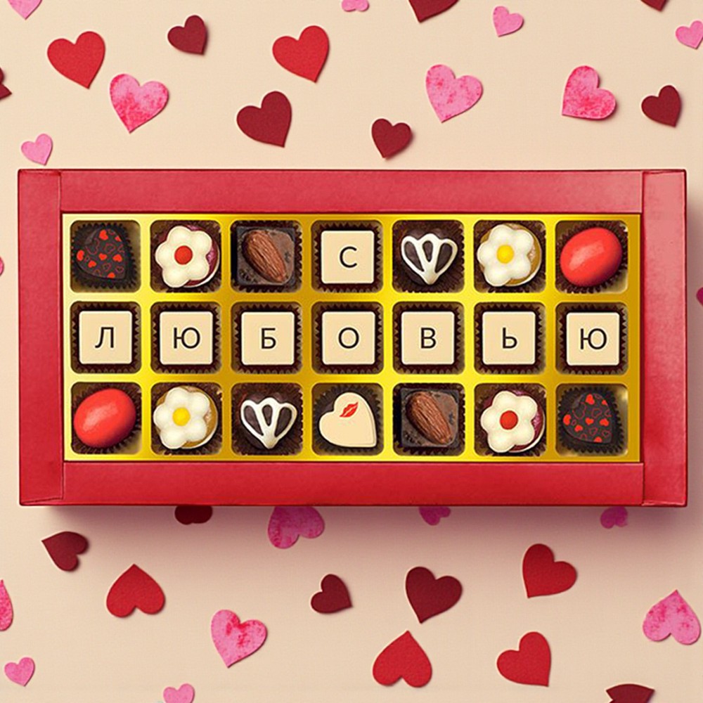 шоколадные массы – какао-масло, какао-тертое, сахар, молоко сухое цельное, молоко сухое обезжиренное, лактоза, эмульгатор (лецитин соевый), ароматизаторы («Ванилин», «Земляника»), эмульгатор (Е476), краситель натуральный пищевой («Кармин»); начинки – сахар, патока, какао-масло, какао тертое, молоко сгущенное (молоко цельное, сахар (сахароза, лактоза)), молоко сухое цельное, молоко сухое обезжиренное, рафинированные, дезодорированные, растительные масла, натуральные концентрированные соки, кумкват, ядра орехов миндаля, фундук жареный тертый, марципановая масса, стабилизатор (мальтодекстрин), желирующие агенты (агар, желатин), коньяк (дистиллят коньячный, вода, сахар, натуральный пищевой краситель «Карамельный колер»), спирт этиловый ректификованный, консервант (сорбиновая кислота), регулятор кислотности (лимонная кислота), эмульгаторы (лецитин соевый, Е471), ароматизаторы («Апельсин», «Вишня», «Ваниль», «Миндаль», «Клубника», «Кокосовые сливки»),натуральные пищевые красители «Карамельный колер», декор – пищевые красители