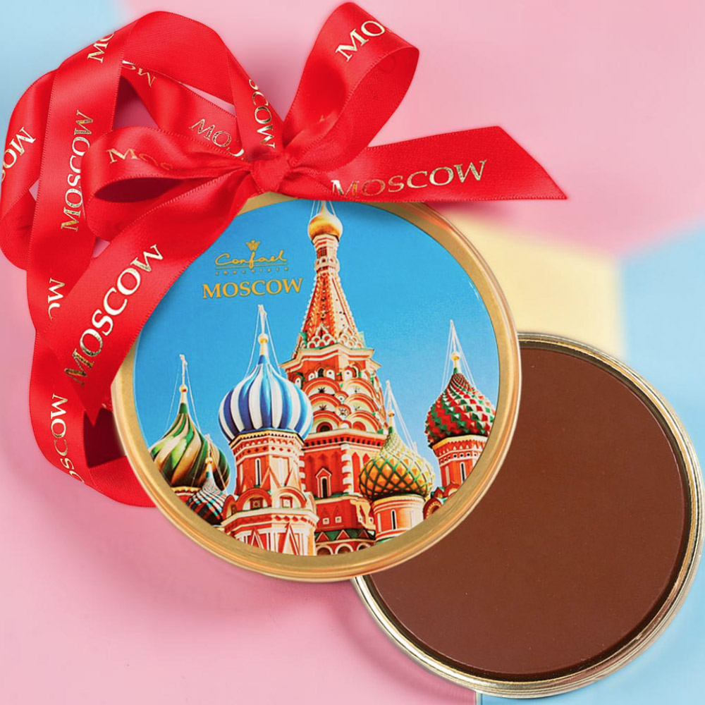 Сувенирная медаль «Собор Василия Блаженного» - желанный презент для ценителей молочного шоколада.