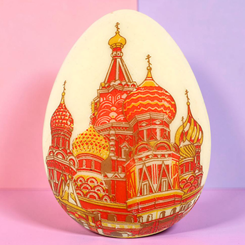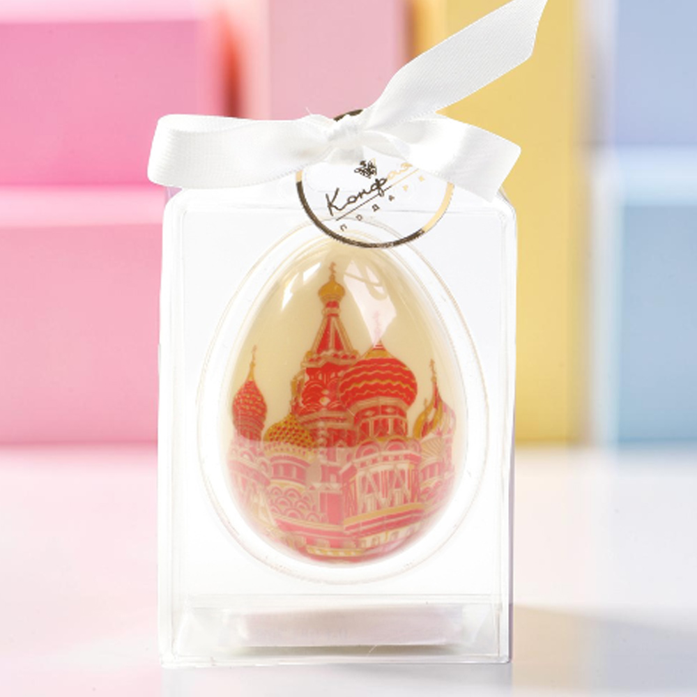Изящная упаковка с вкусным шоколадом в виде яйца с изображением собора Василия Блаженного - дивный сувенир для вашего близкого человека или просто хорошего друга.