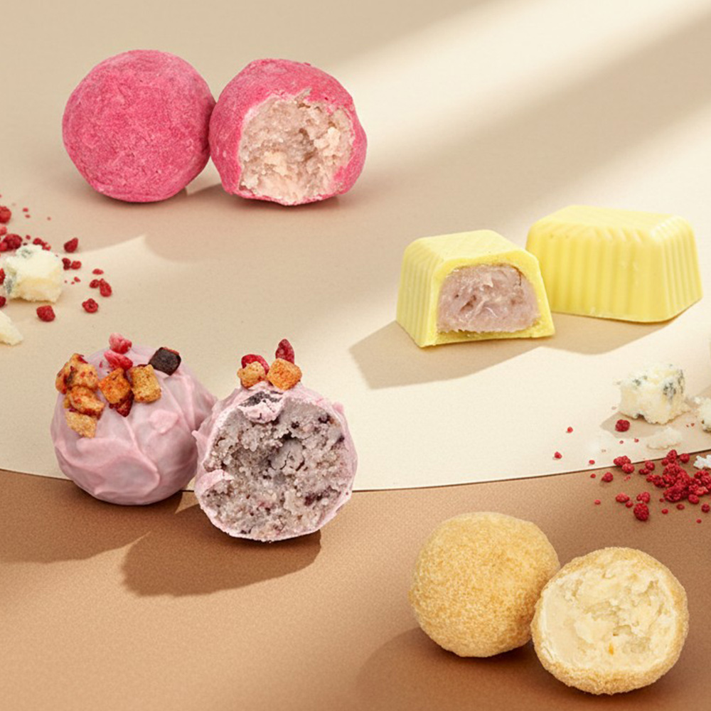 Нежные трюфели в клубничной и вафельной крошке, конфеты в лимонном и розовом шоколаде, классические сочетания шоколада, какао и карамели — каждая конфета создана вручную мастерами фабрики и отличается гармоничным балансом сладости и благородной сырной пикантности.