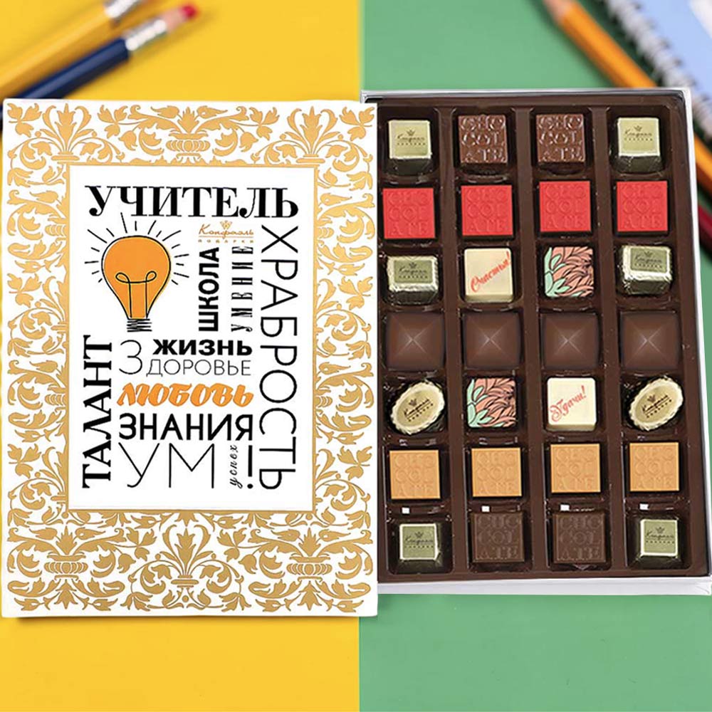 шоколадные массы - какао-масло, какао тертое, сахар, молоко сухое цельное, молоко сухое обезжиренное, лактоза, эмульгатор (лецитин соевый), ароматизатор («Ванилин»); начинки - сахар, патока, какао-масло, какао тертое, молоко сгущенное (молоко цельное, сахар (сахароза, лактоза)), сливки сгущенные с сахаром (сливки нормализованные, сахар (сахароза), лактоза), молоко сухое, рафинированные дезодорированные растительные масла, натуральные концентрированные соки, стабилизатор (мальтодекстрин, гуммиарабик), желирующие агенты (агар, желатин говяжий), коньяк (дистиллят коньячный, вода, сахар, натуральный пищевой краситель «карамельный колер»), спирт этиловый ректификованный, консервант (сорбиновая кислота), регулятор кислотности (лимонная кислота), эмульгаторы (лецитин соевый, Е471), ароматизаторы («Вишня», «Апельсин», «Ваниль», «Черная смородина»,«Клубника», «Карамель», «Кофе», «Кокосовые сливки», «Бейлиз»), натуральный пищевой краситель «Карамельный колер»; декор - пищевые красители (куркумин, Е132, Е171), пищевой краситель (концентрированный сок красной свёклы, масло подсолнечное, эмульгаторы (мальтодекстрин, Е472с), регуляторы кислотности (лимонная кислота, аскорбиновая кислота))