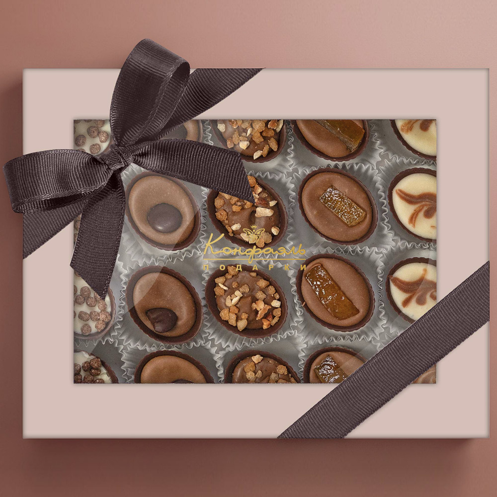Состав: шоколад – сахар, какао тёртое, масло какао, эмульгатор (лецитин соевый), ароматизатор; начинки – сахар, какао-масло, молоко сухое обезжиренное, масла растительные рафинированные дезодорированные (подсолнечное, рапсовое, оливковое; масло сливочное (из пастеризованных коровьих сливок), молоко сухое обезжиренное), паста из кофе (кофе, растительный жир), рис воздушный с какао (крупа рисовая, сахар, какао, соль), цукаты апельсиновых корочек, апельсин сушеный, кофе натуральный молотый, эмульгаторы (лецитин соевый, Е471), ароматизаторы. Продукция производится на предприятии, где используются арахис, кунжут, орехи, яичные и молочные продукты, злаки, содержащие глютен.