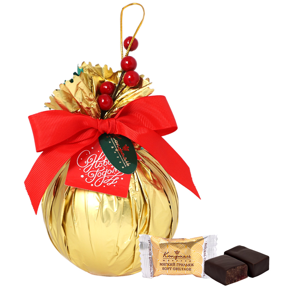 Ёлочный шар с конфетами мягкий грильяж золотой 110г