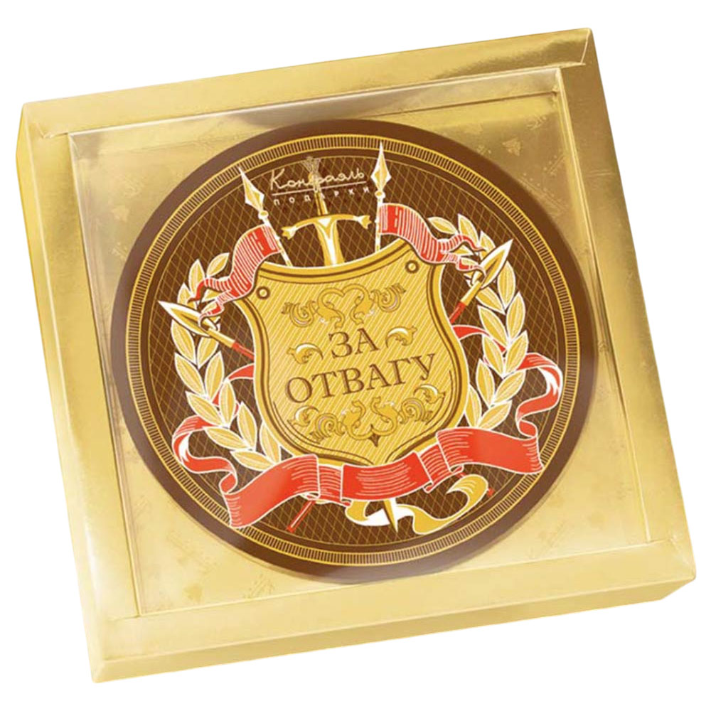 Торжественная медаль «За отвагу!» из молочного шоколада, диаметром 30 см - для вашего мужчины! Дарите ему десерты почаще - и он будет совершать чудеса самопожертвования ради вас и семьи.